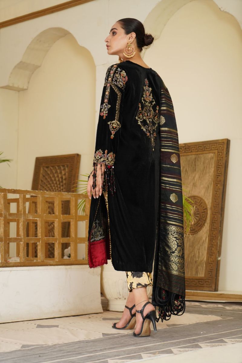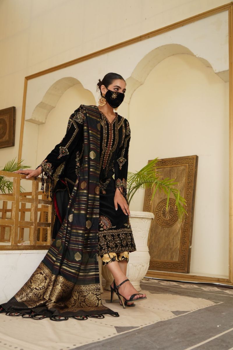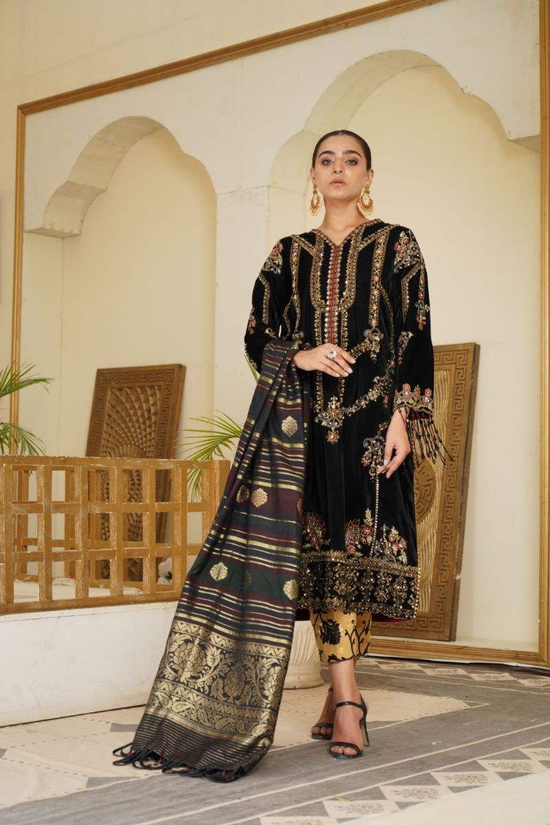 Personifying eternal grace and elegance with a velvet ensemble adorned with the most delicate golden embellishments paired with a golden trousers.