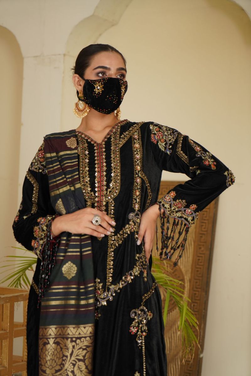 • Black velvet long shirt adorned with multi-colour embroidery & tilla work