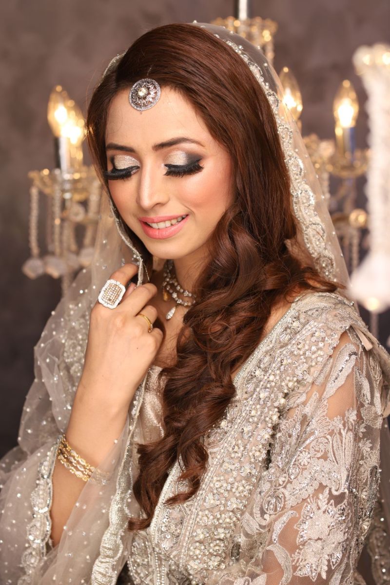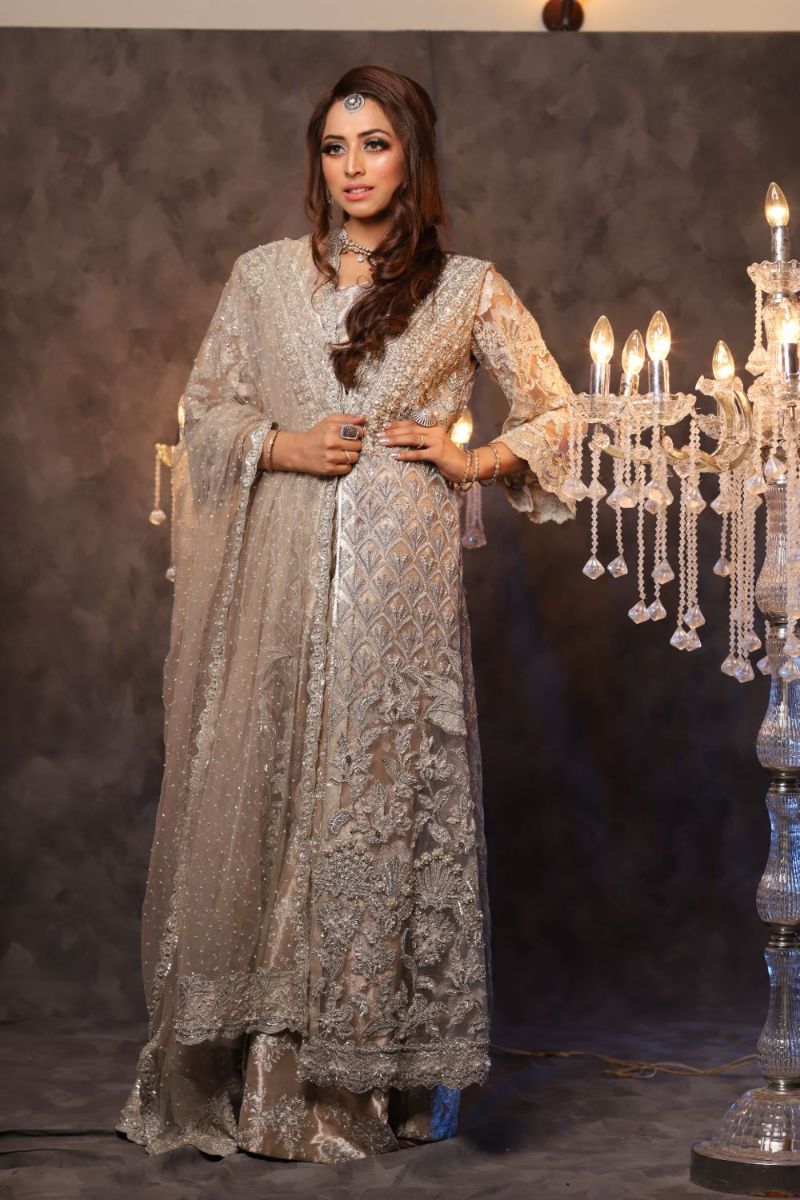 For the gorgeous brides who want to fashion a sumptuous bridal look on their big day with our meticulously handcrafted net gown with intricate silver tilla and adda work using crystals, zircons and pearls on beige base and traditional inlaid floral motifs! It is coupled with high wasted Indian tissue pants and a net dupatta with pearls spray and add work on the borders!,
