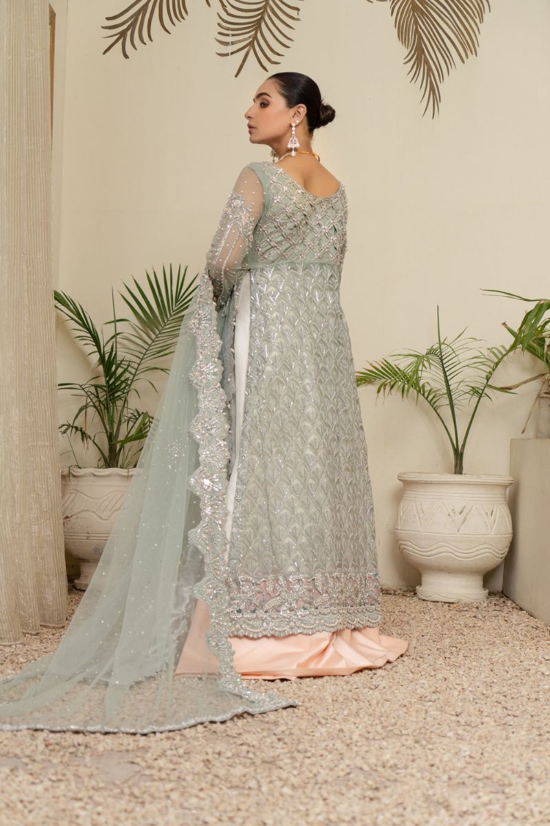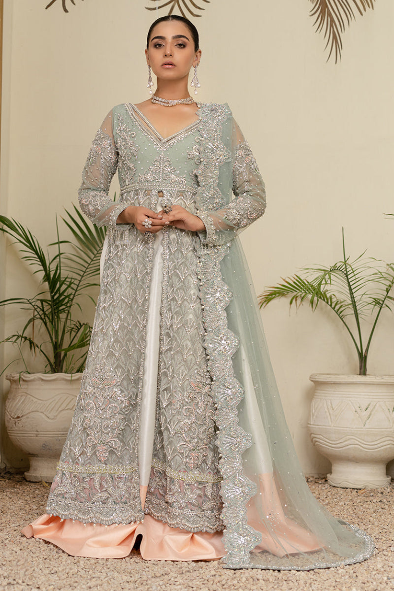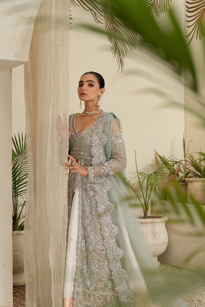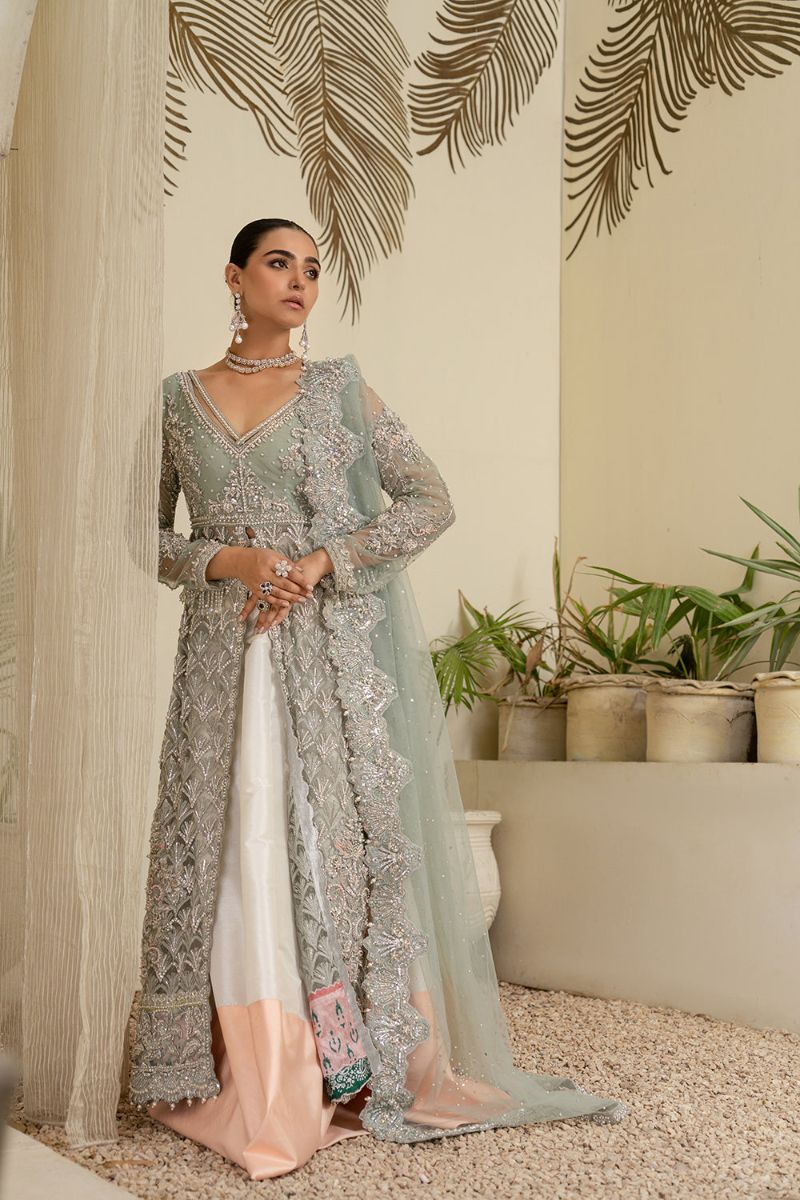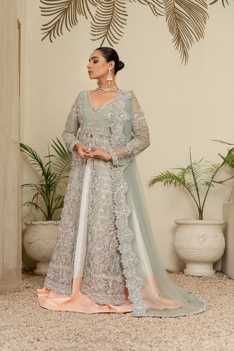 Details : This mint green dress is breath taking elegant and regal with its swarovski and crystal work . The solid rawsilk lehenga gives it modern vibe. The dupatta enhanced its beauty with scalloped embellished borders.