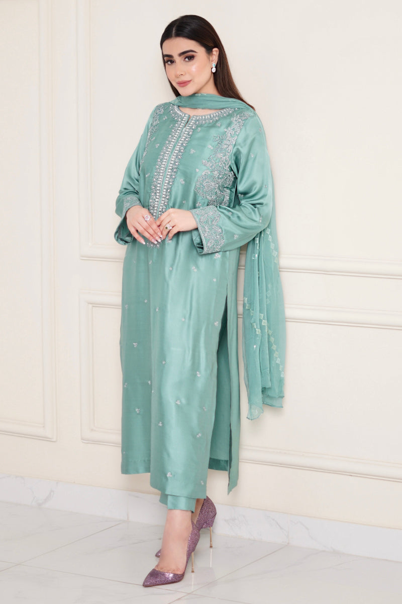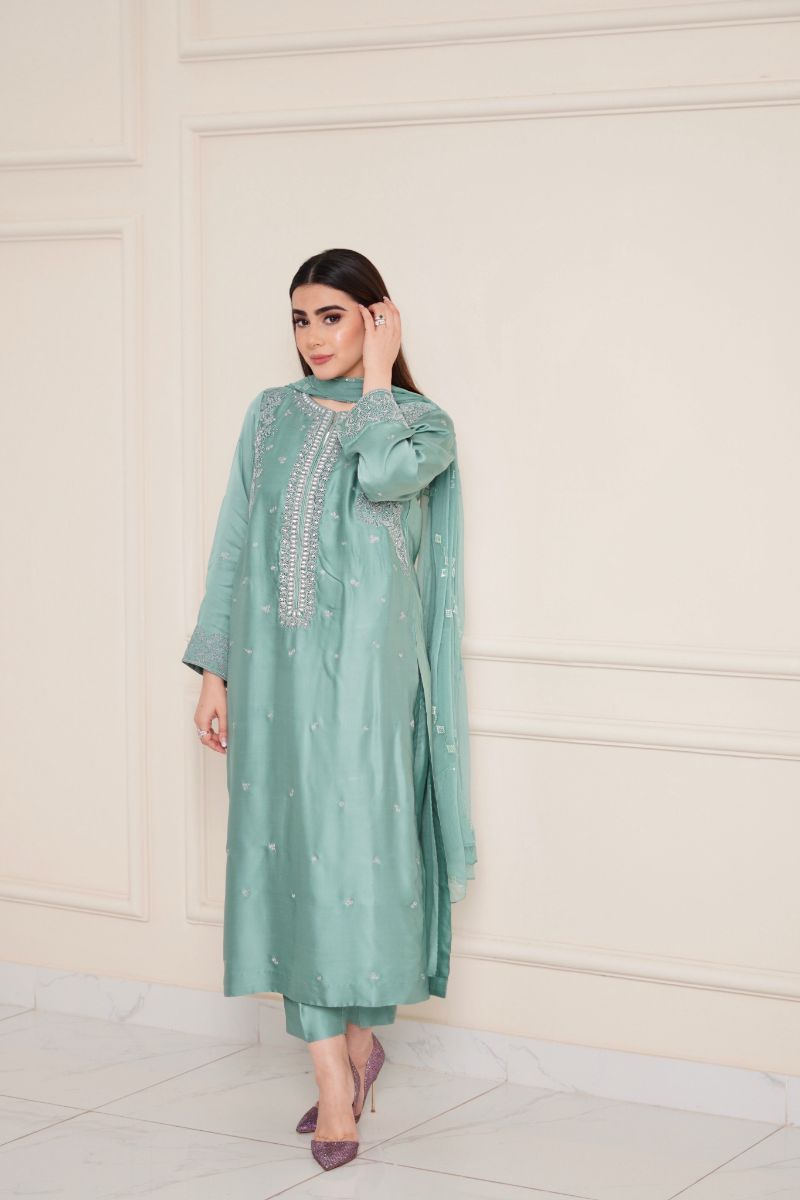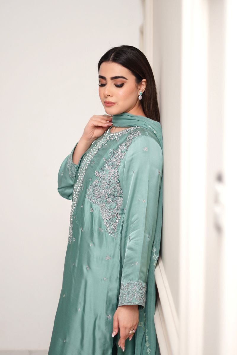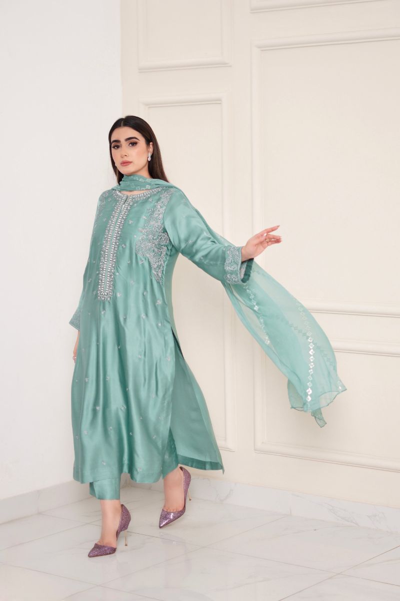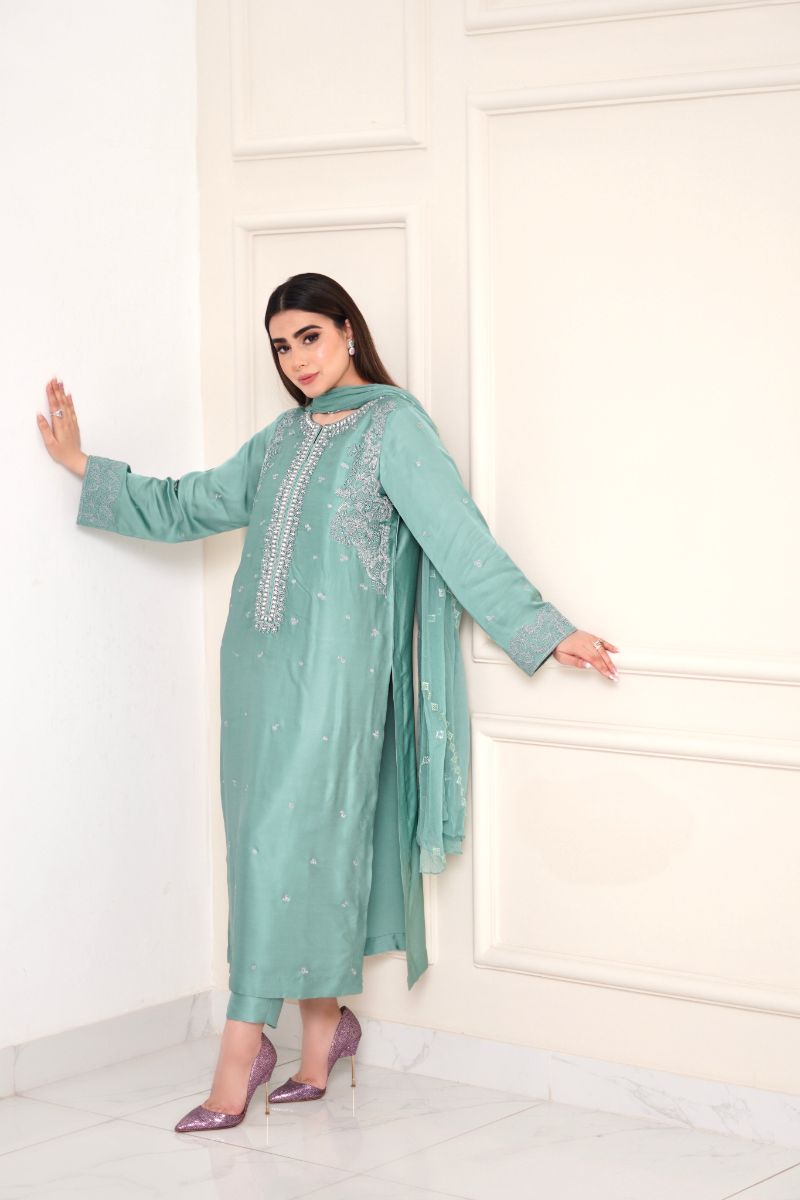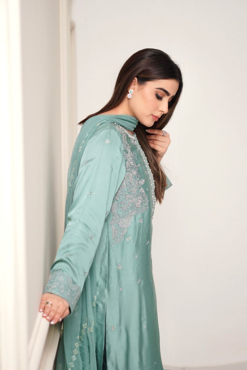 Aqua breeze is beautifully adorned with dori work & neckline embellished with different size of pearls to enhanced the elegance of the outfit .paired with matching trouser and embroidered chiffon dupatta.