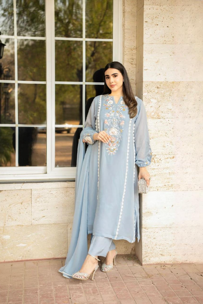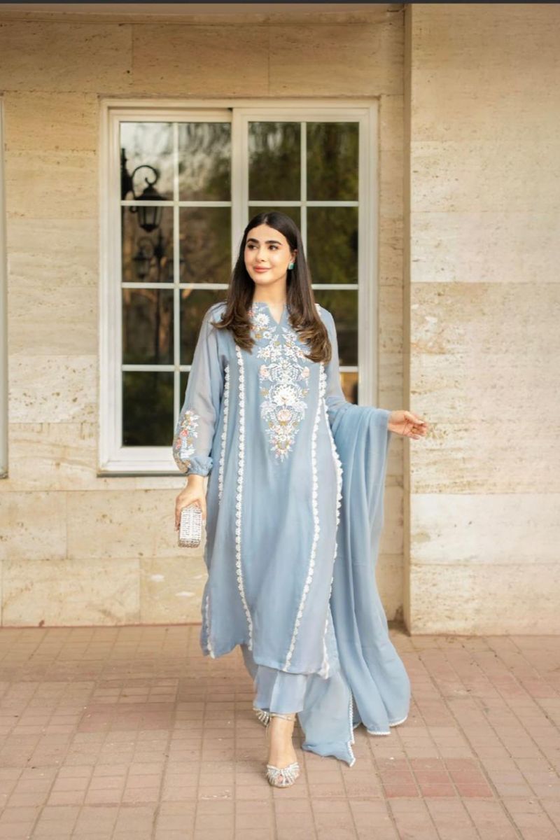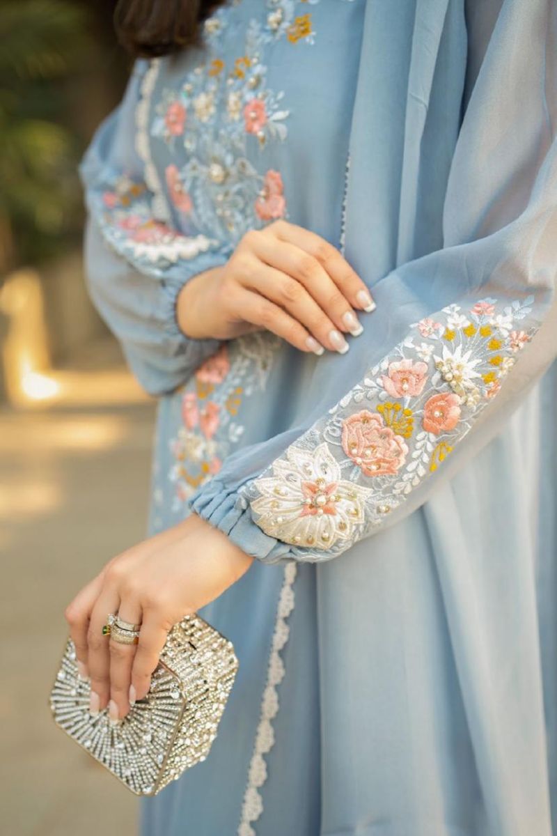 This dress showcases beautiful cutwork and shesha detailing on the shirt, with intricate handwork adorning the neckline for a touch of elegance. The trousers are designed with matching cutwork and shesha, tying the entire look together. This combination of delicate embroidery and unique design elements creates a stylish and graceful outfit, perfect for special occasions.