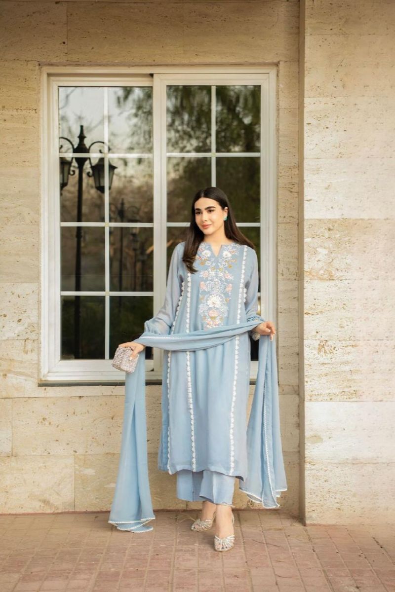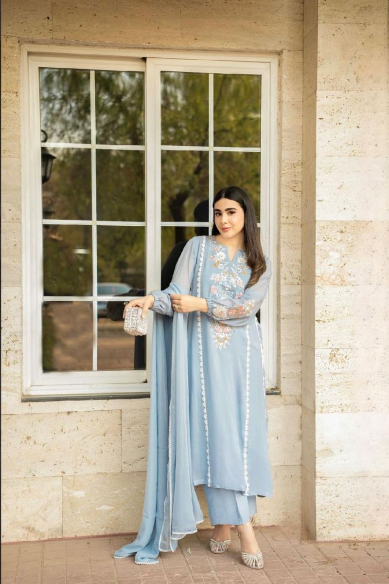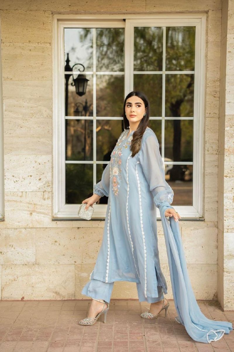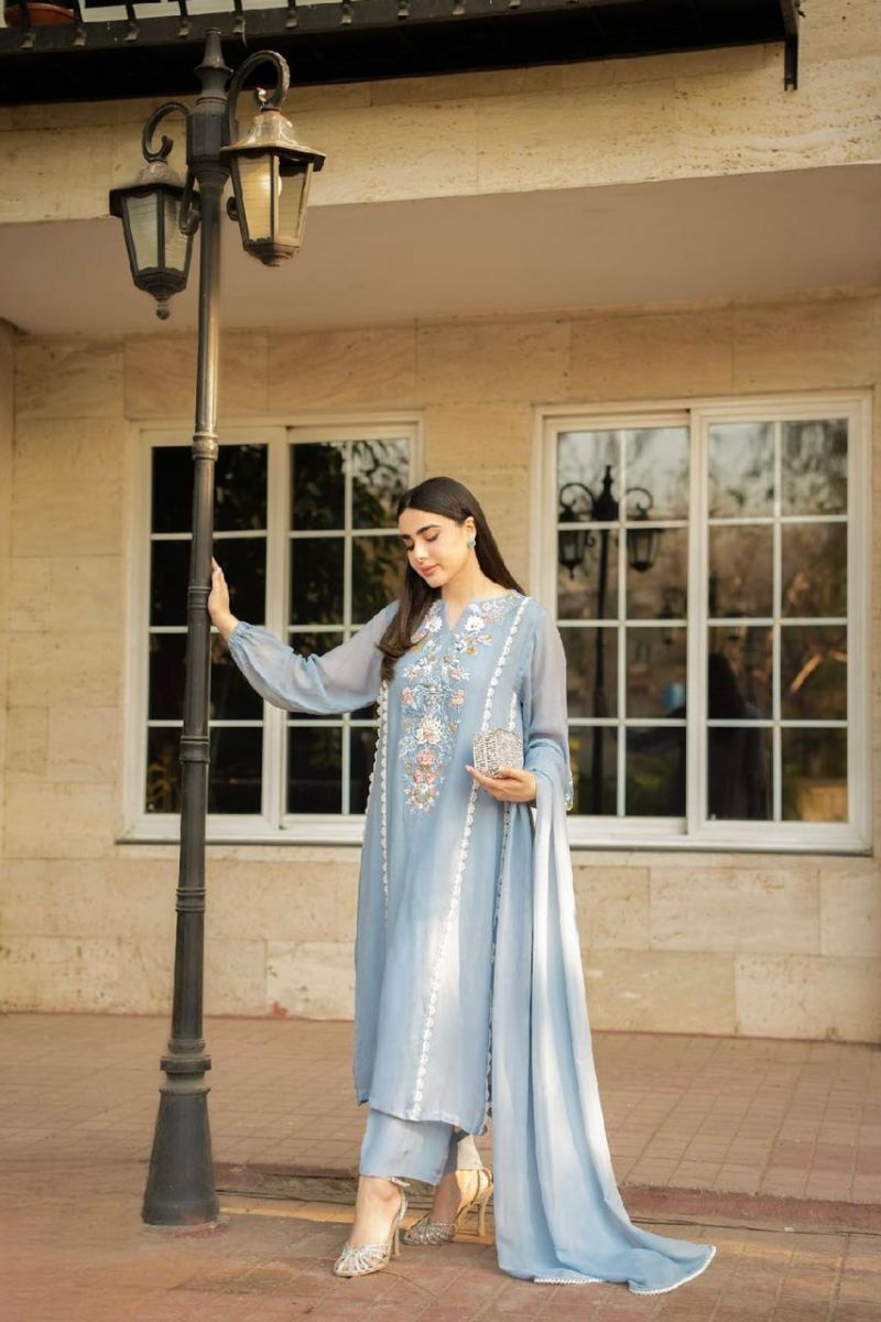 This dress showcases beautiful cutwork and shesha detailing on the shirt, with intricate handwork adorning the neckline for a touch of elegance. The trousers are designed with matching cutwork and shesha, tying the entire look together. This combination of delicate embroidery and unique design elements creates a stylish and graceful outfit, perfect for special occasions.
