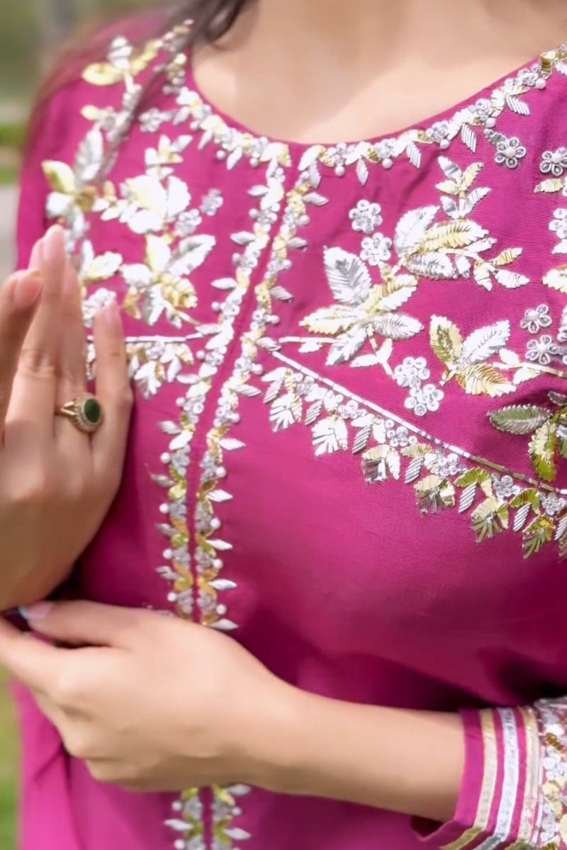 Introducing our stunning Mulberry Ensemble in a vibrant color. This exquisite 3-piece outfit features a front-open Korean raw silk shirt, adorned with intricate silver and gold makesh handwork. Paired with sleek raw silk trousers, it offers a perfect blend of luxury and comfort. Completing the look is a delicate chiffon dupatta, adding an ethereal touch. Embrace the allure of silver and gold craftsmanship with this captivating ensemble, designed to make you shine at any occasion.
