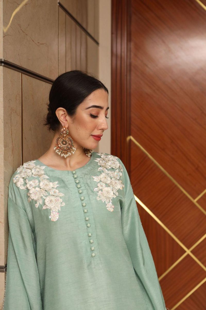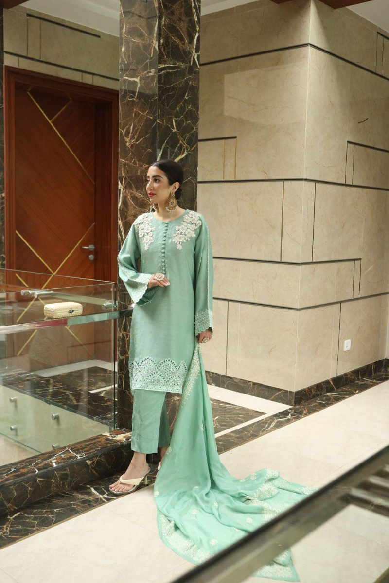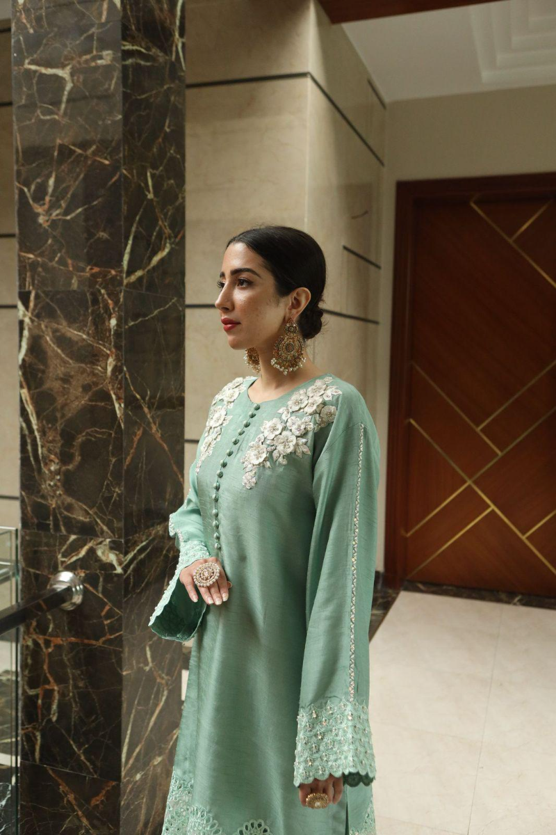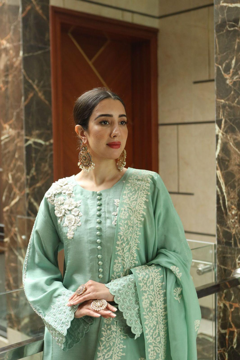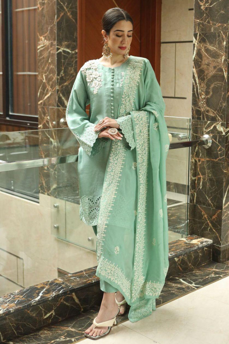 This effortlessly chic set features a refreshing mint green, detailed with 3D floral embroidery, handcrafted accents on the neckline and sleeves, and Schiffli borders that add texture and finesse. Buttons run down the front for a tailored, elevated finish. It's paired with straight-cut trousers for a sleek silhouette, and a block-printed chiffon dupatta that adds movement and a subtle pop of print to the look.