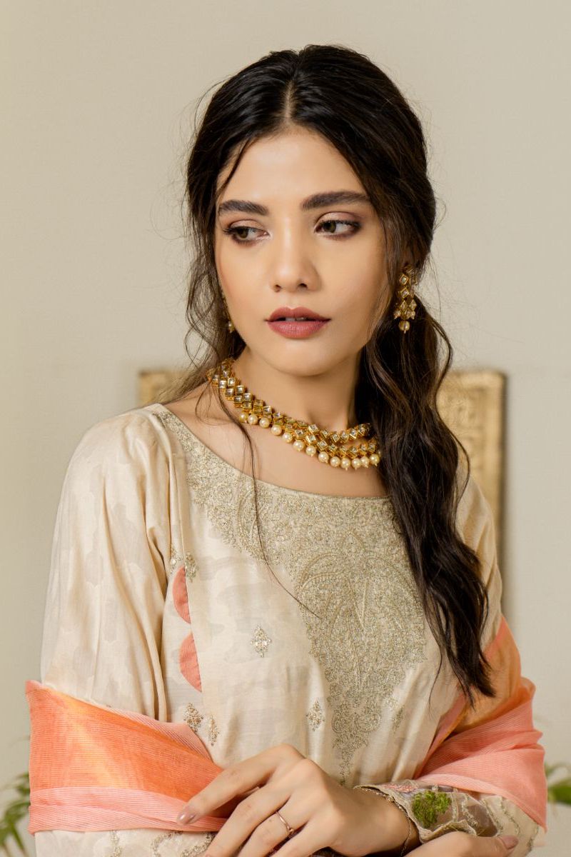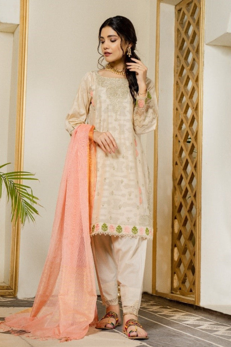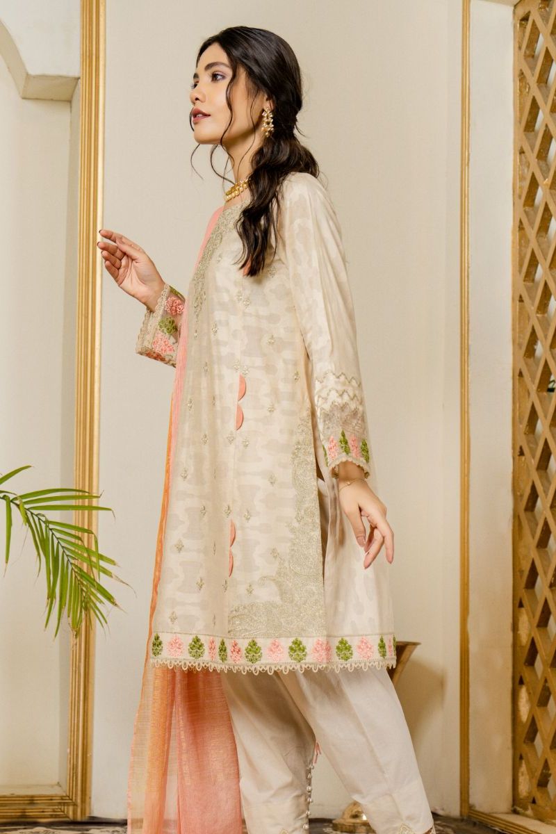 Add a subtle brilliance to your summer wardrobe with this beige luxury lawn ensemble paired with a tissue organza dupatta in contrasting hues.