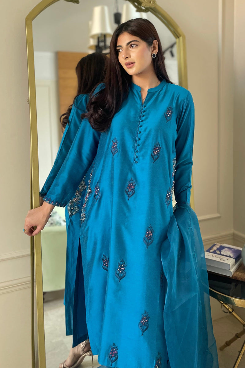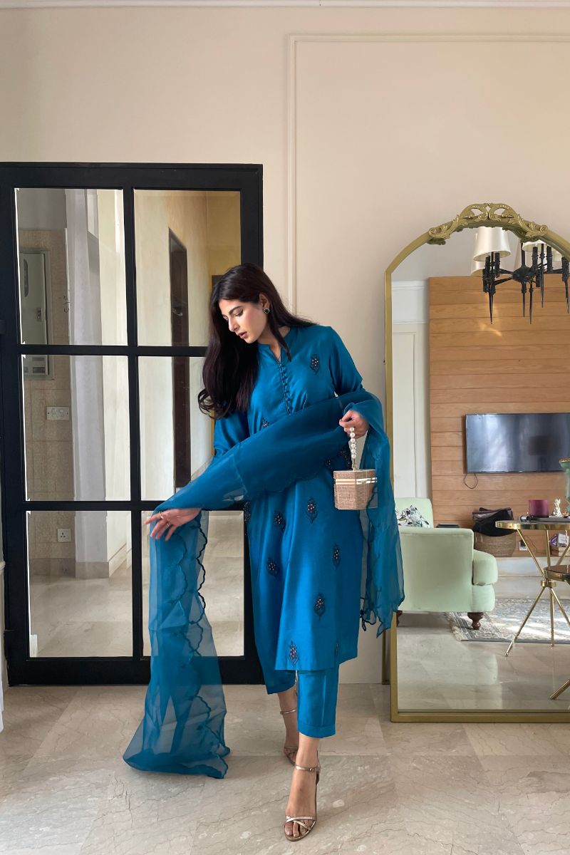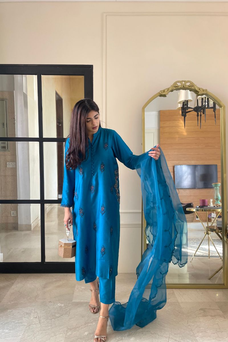 Details: Rendered in a ravishing tone of Teal blue and adorned with meticulously crafted tilla embroidery with swaroski spray & resham work on the side & front. It is paired with straight pants & scalloped dupatta