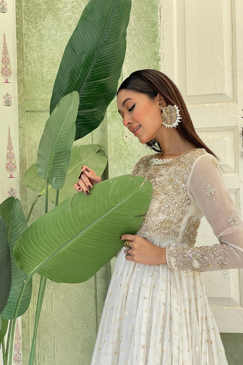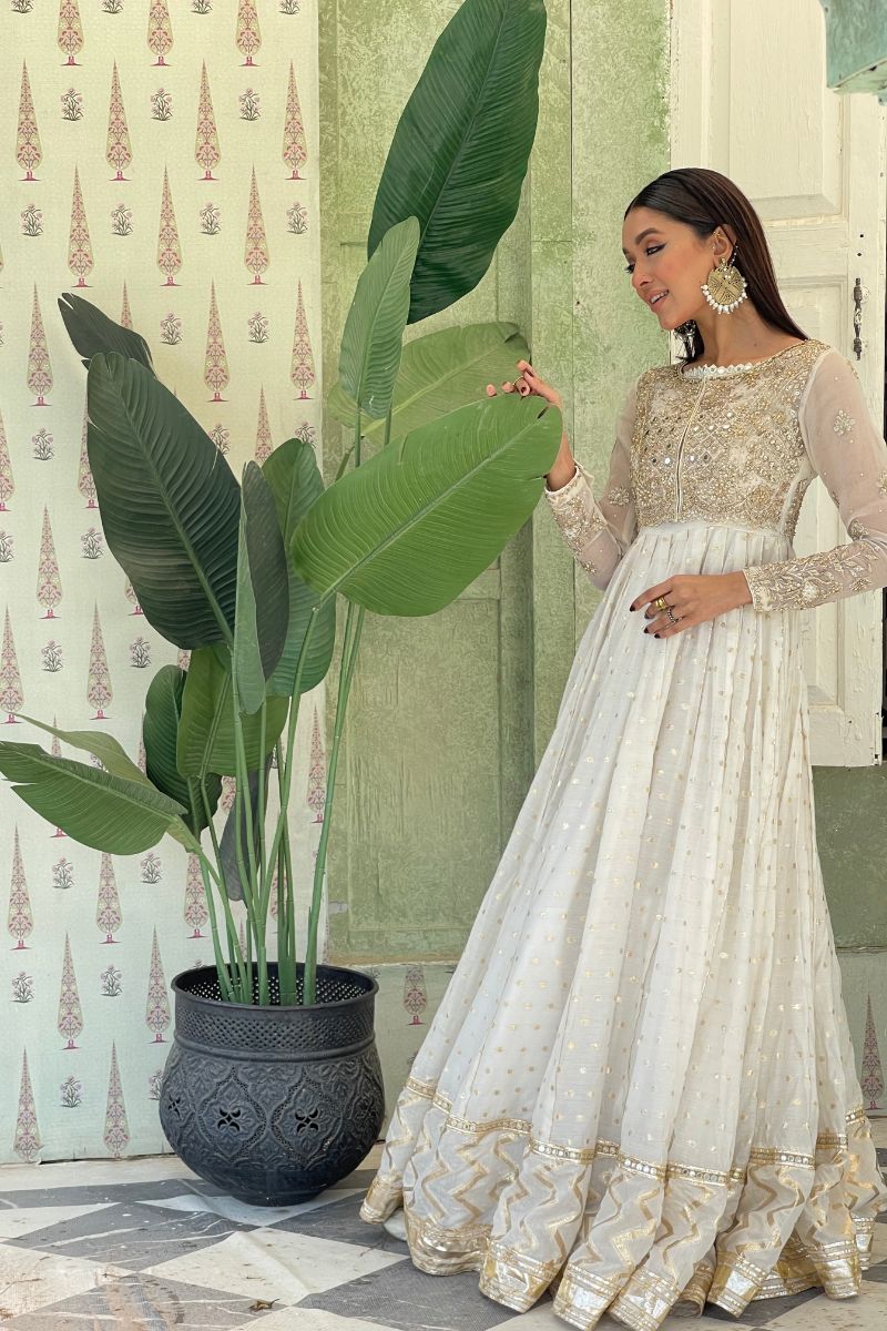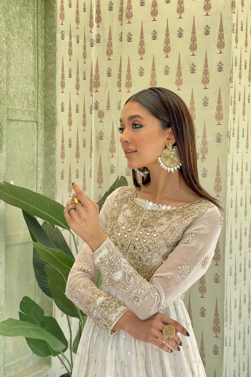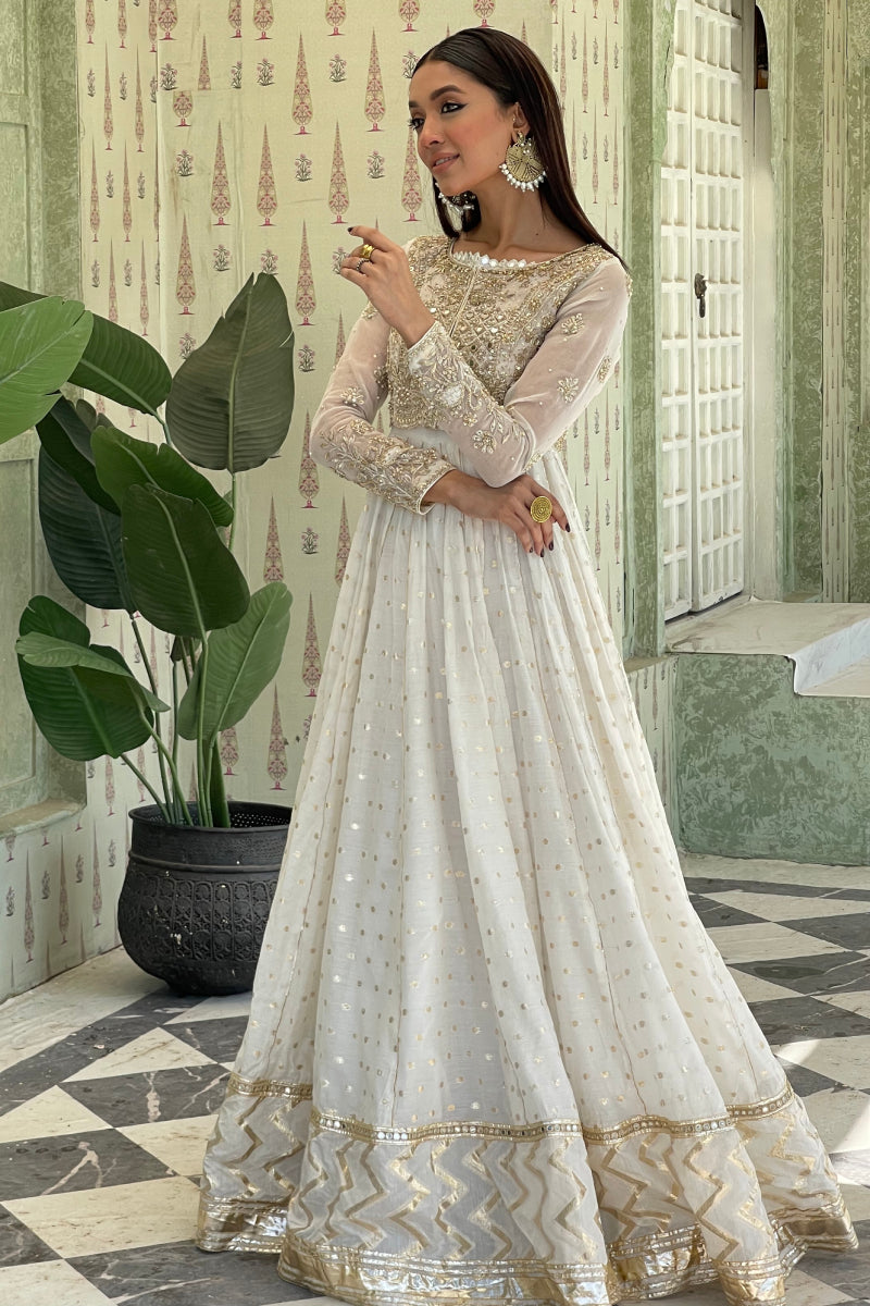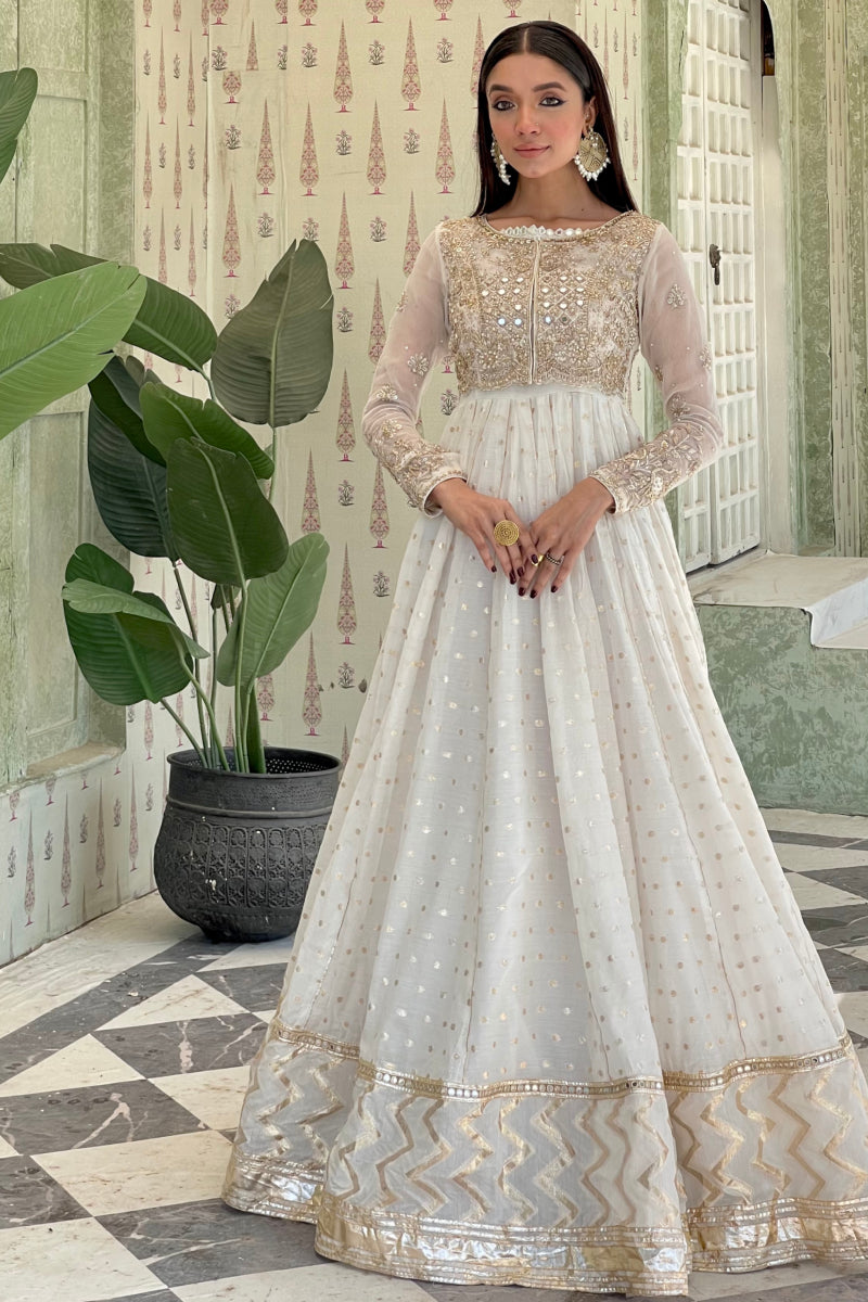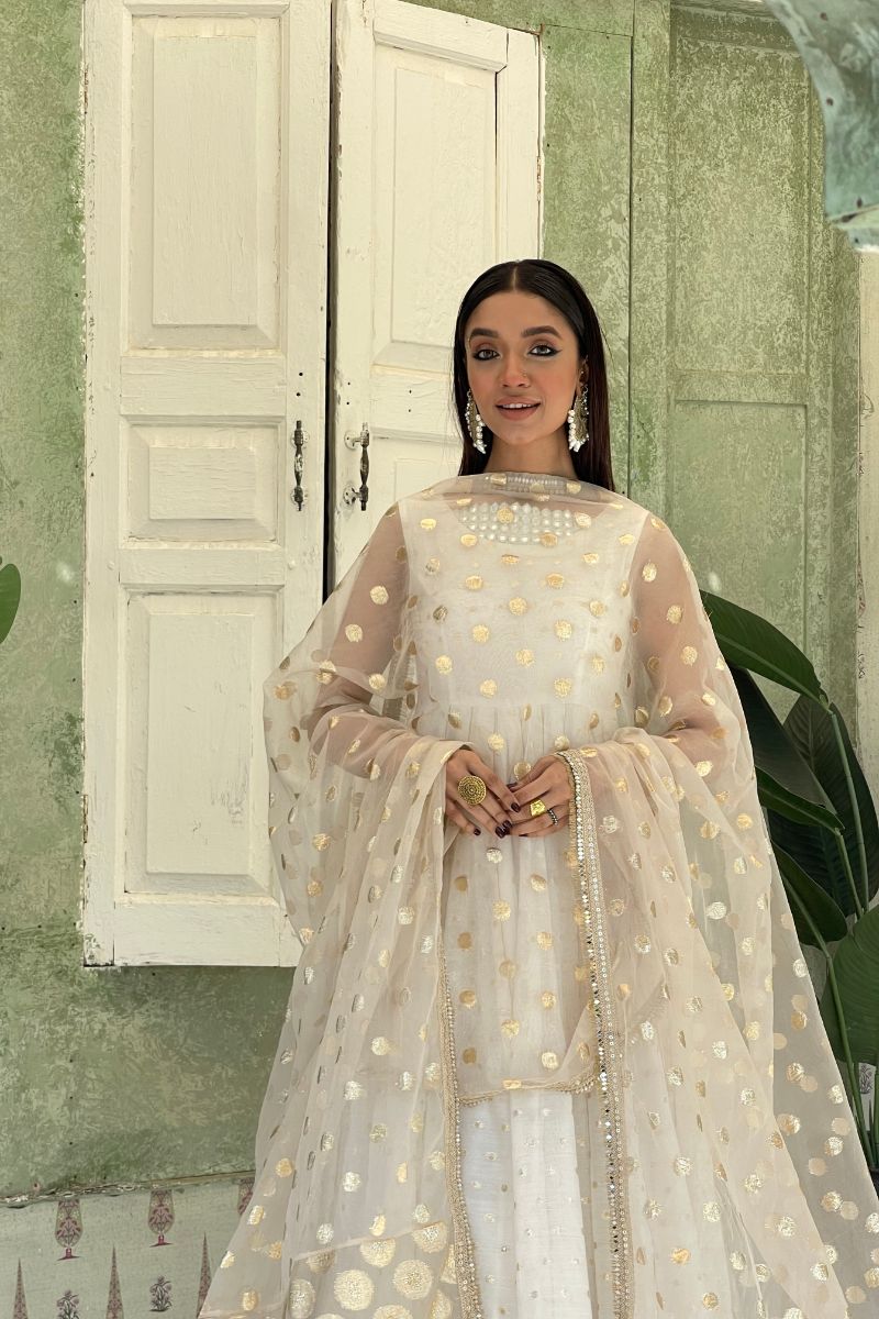 An irresistible white khaddi weaved zari pishwaas has fully embellished shared organza jacket enhanced with zari, pearl and sheesha work to complete it's traditional look.