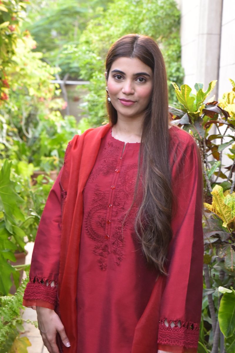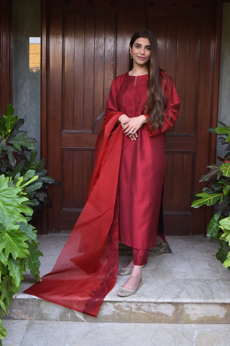Complete attire designed for a Lady with self thread embroidered neckline and added crystals for detail, on sleeves stitching detail is added with lace paired with Victorian embroidered organza dupatta.