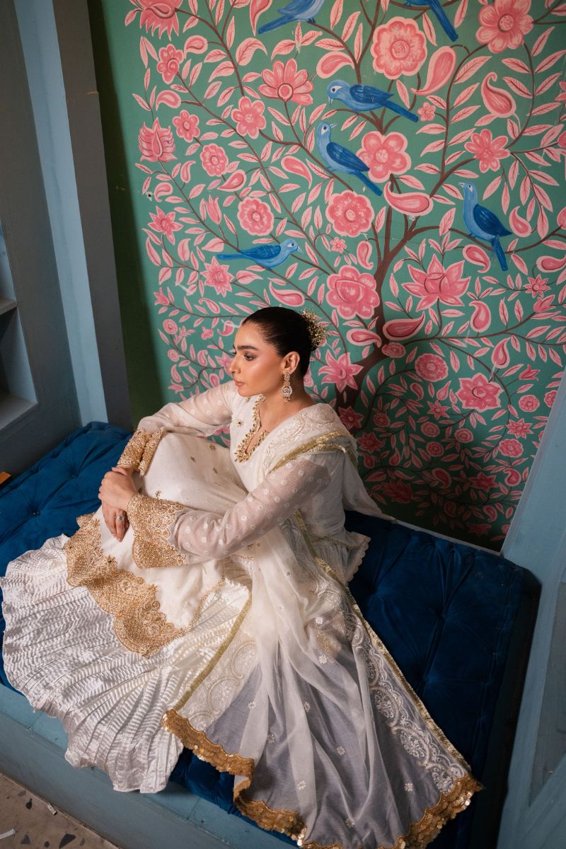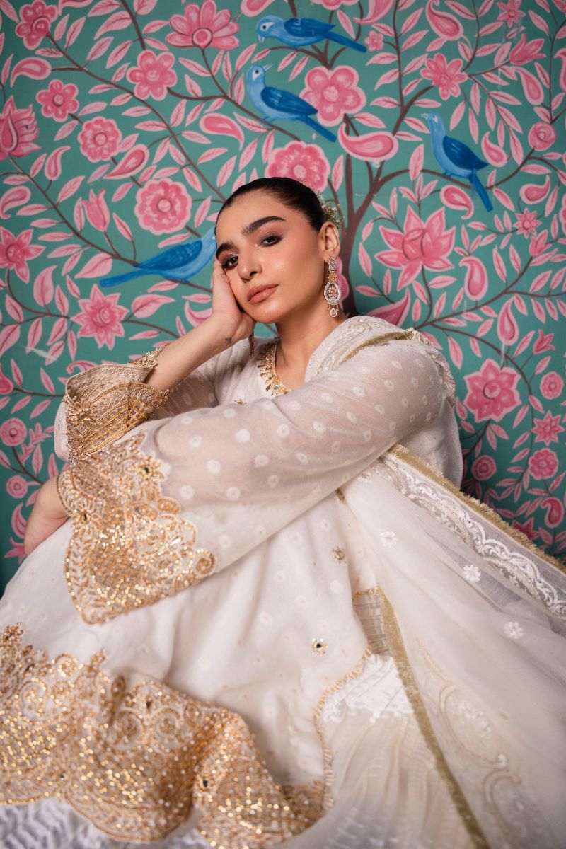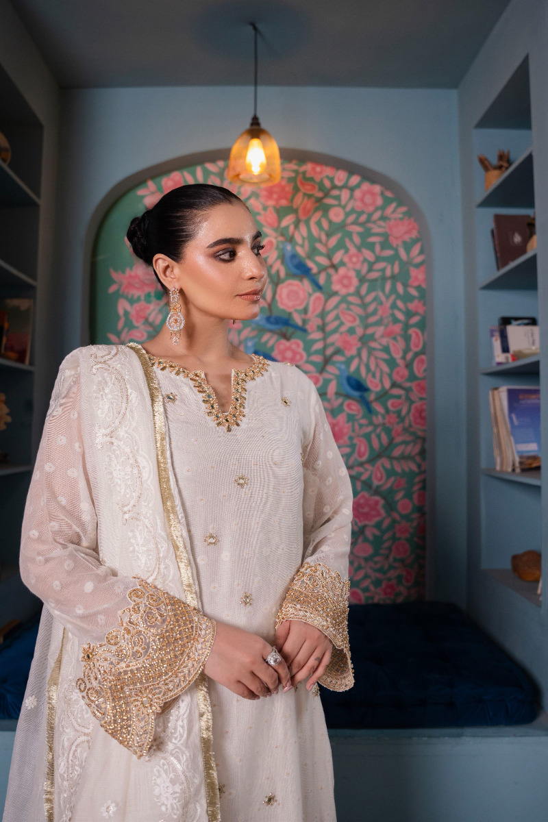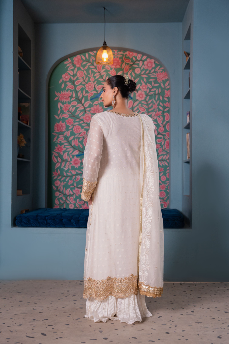 This exquisite ensemble features a white cotton net shirt with intricate embroidery, showcasing a blend of crystal work, zardozi, sheesha, and gotta work that adds a touch of opulence. Complemented by a silk crushed sharara, the outfit offers a luxurious contrast in texture, while the accompanying cotton net dupatta, adorned with matching embroidery and embellishments.