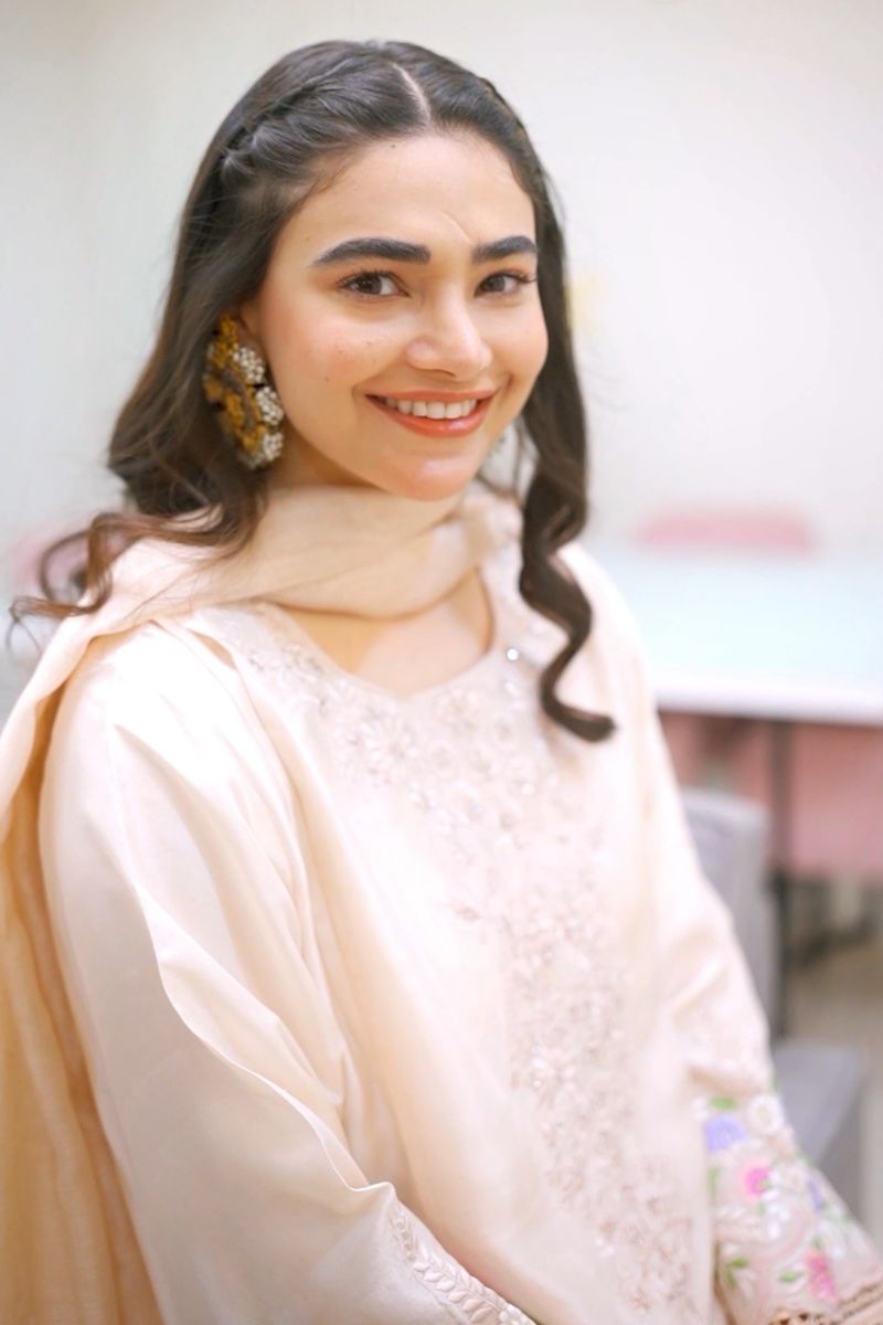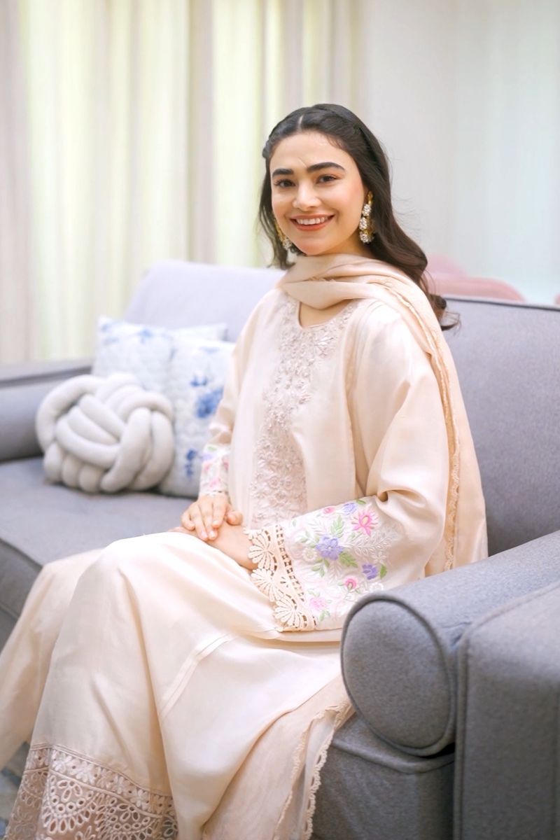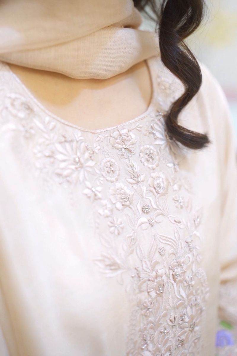 This neutral peach attire is delicately embroidered with resham threads on its neckline, sleeves and shifli border. Neckline embellished with swarovski and french knots add up to its charm. This straight shirt paired with culottes and cotton net dupatta is the perfect choice for your occasion.