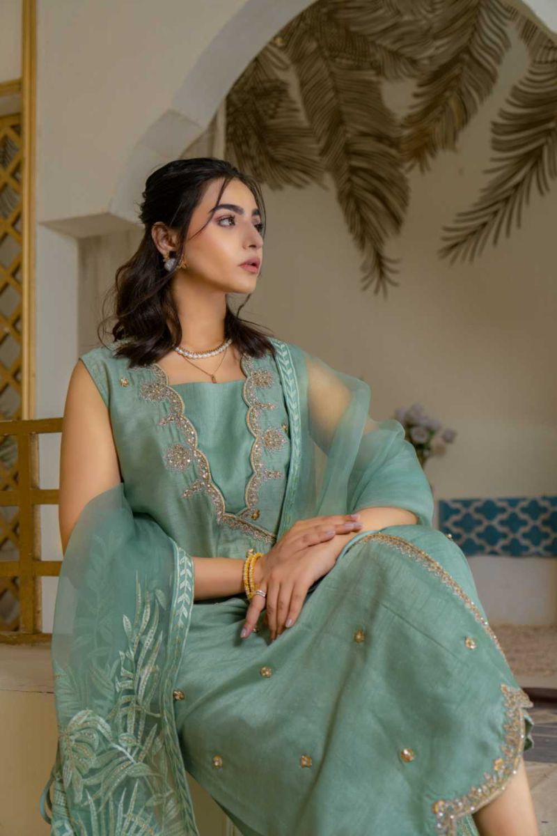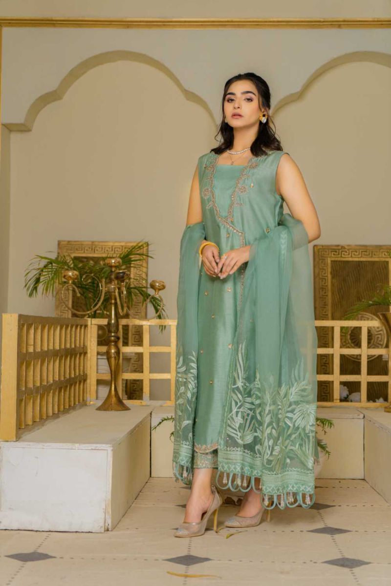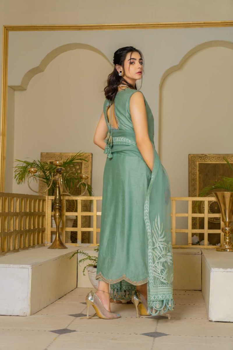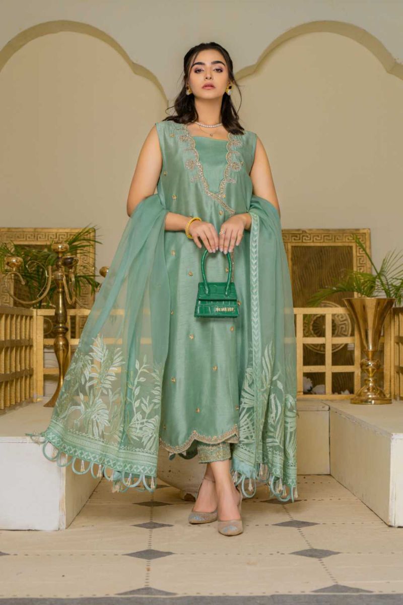 • Pk Raw silk Trousers with tilla embroidery Embroidered organza dupatta with embellished hangings on border Cutline: Angrakha with cigarette pants.