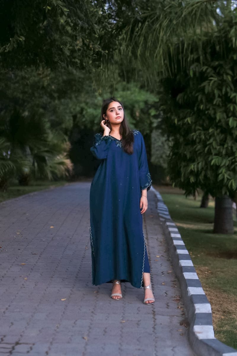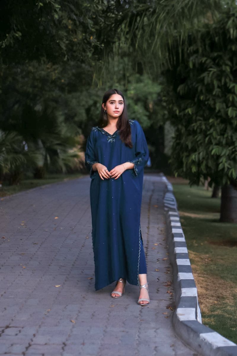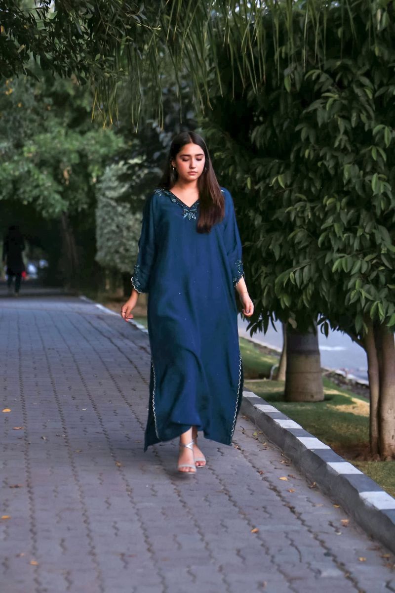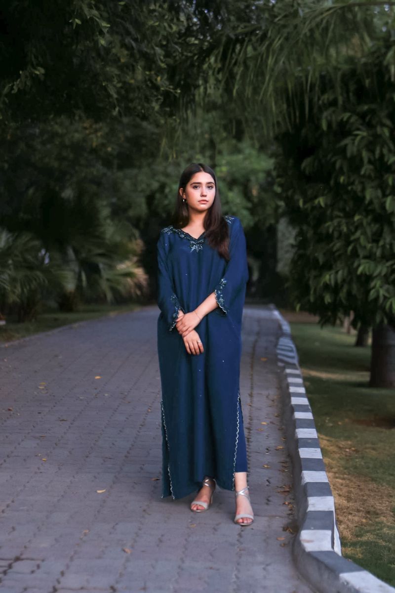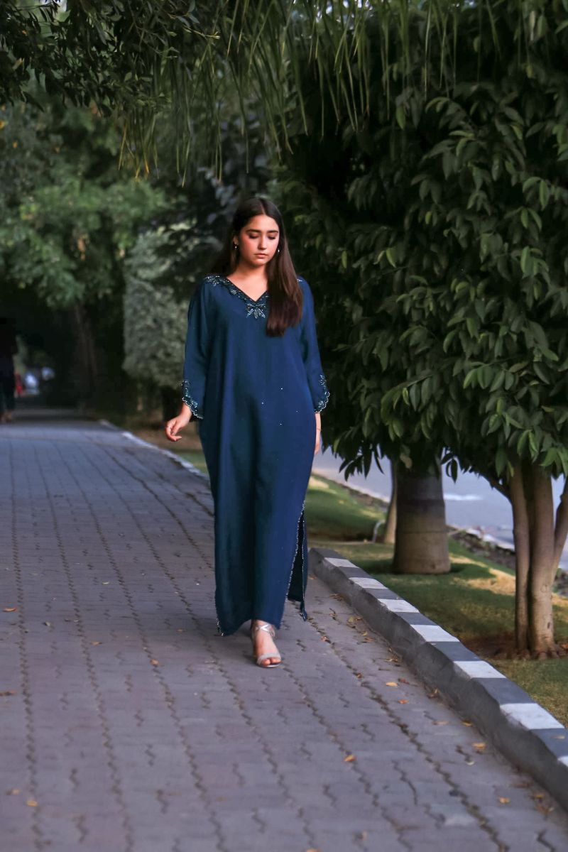 Step into a world of elegance with our latest design "Azure Dream" stunning kaftan, featuring intricate detailing on the neck and sleeves that adds a touch of sophistication and charm. Paired with matching trousers. Perfect for any occasion, this kaftan combines comfort and style effortlessly.