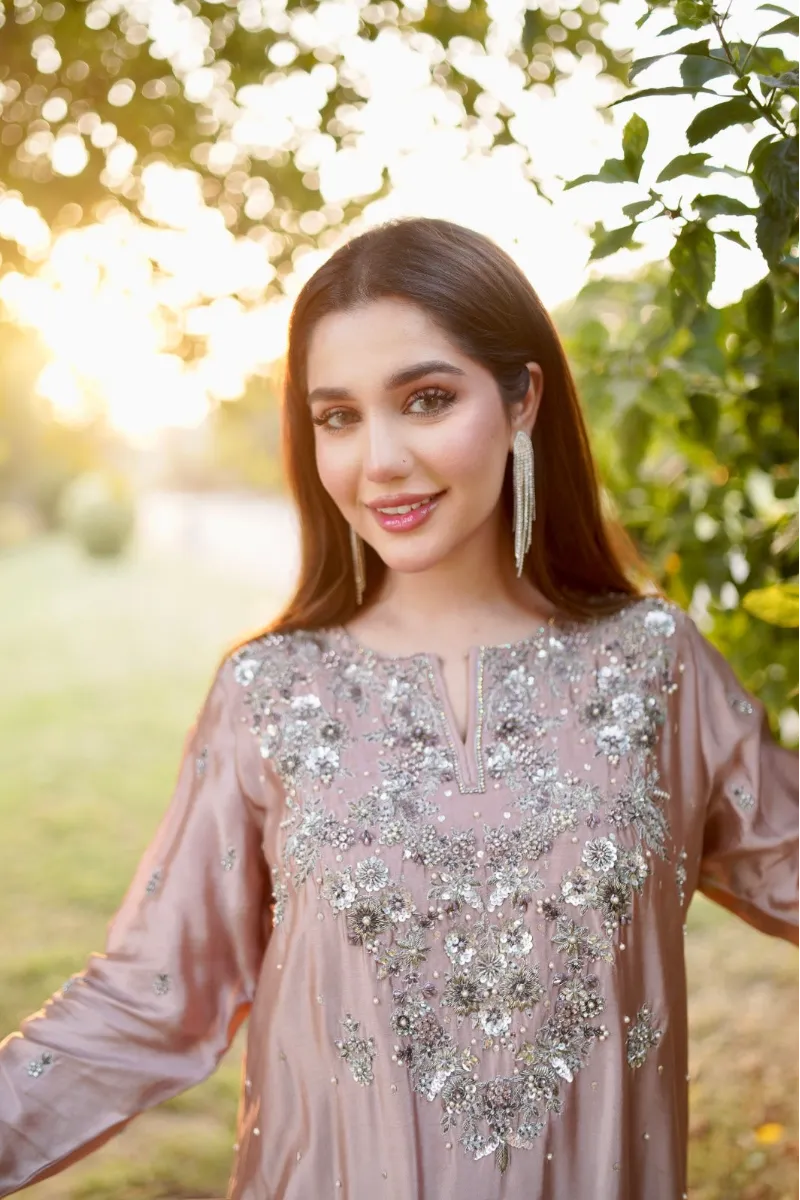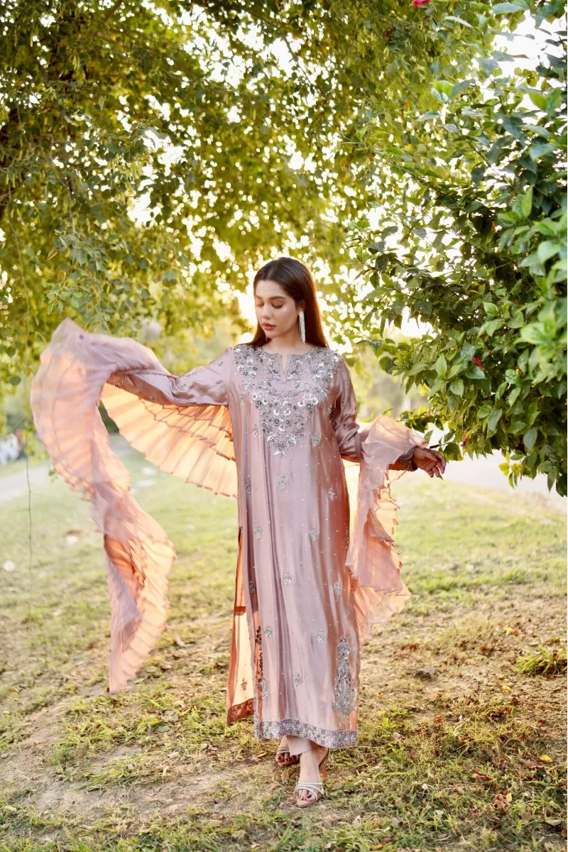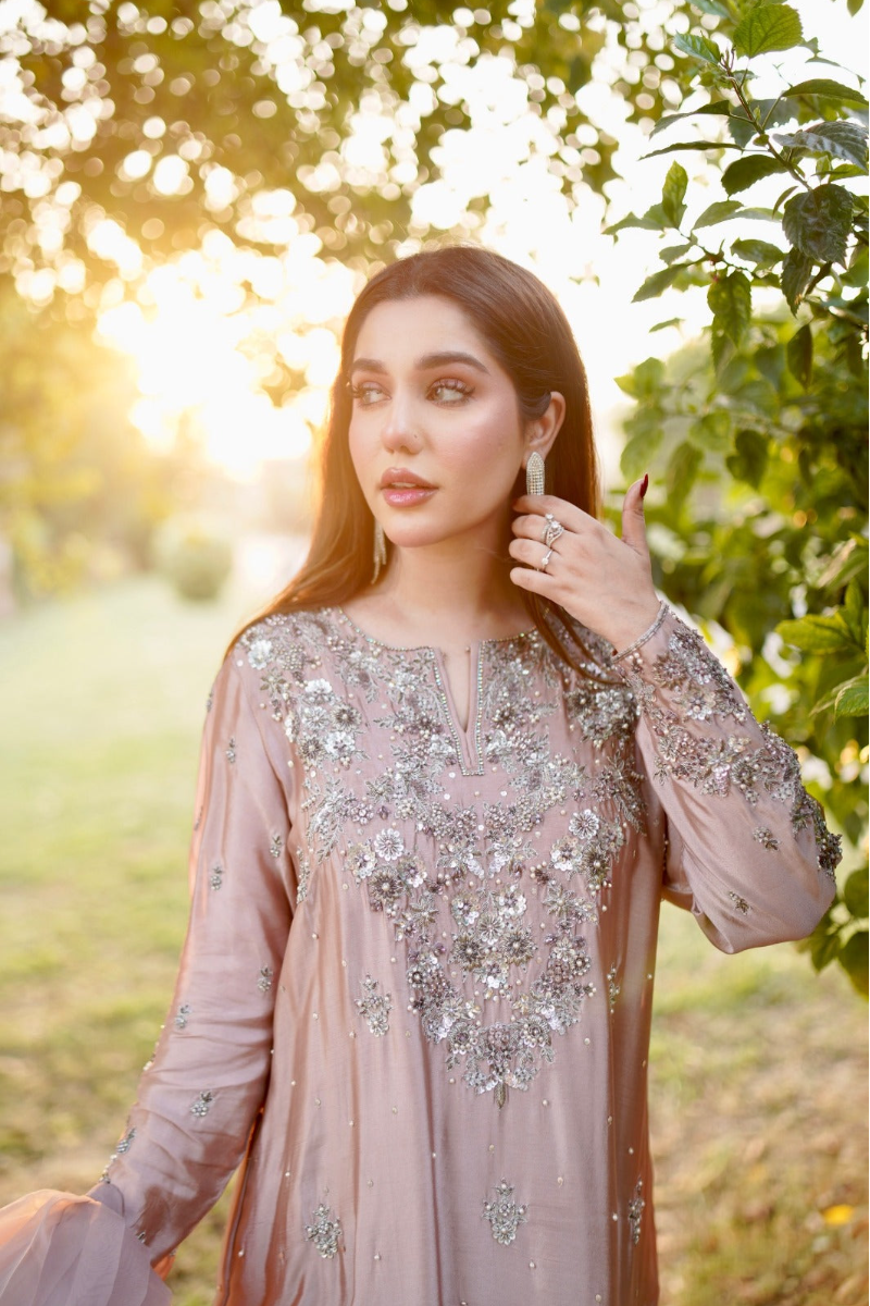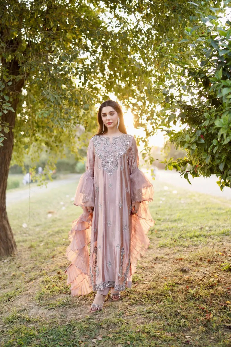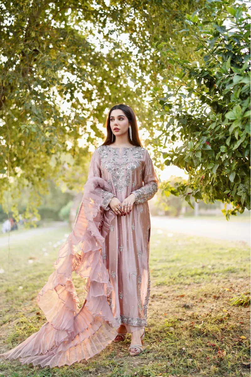 This classic and heavily embellished shirt is adorned with sparkling beads, sequins, pearls, swarovski and threads. It is paired with straight pants and organza ruffled dupatta which is exceptional for your formal events.
