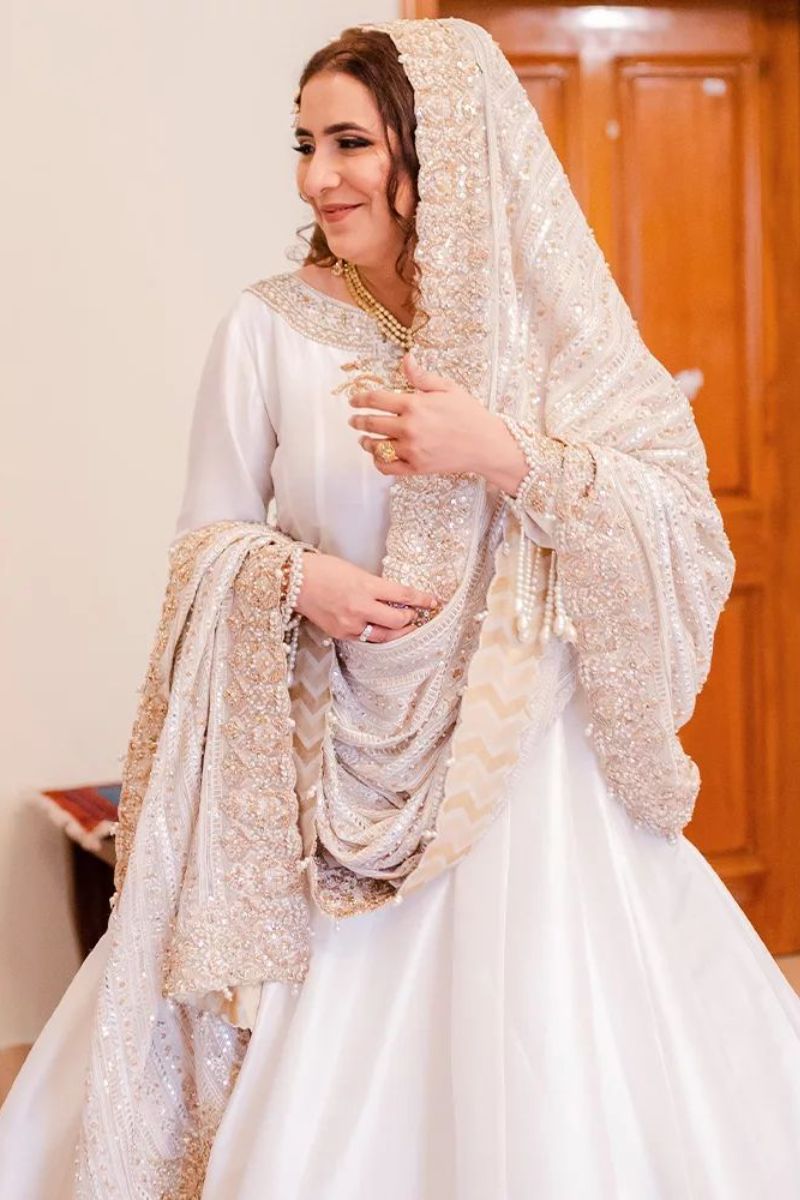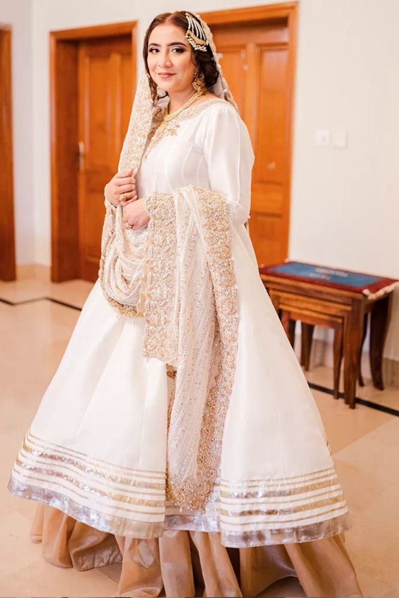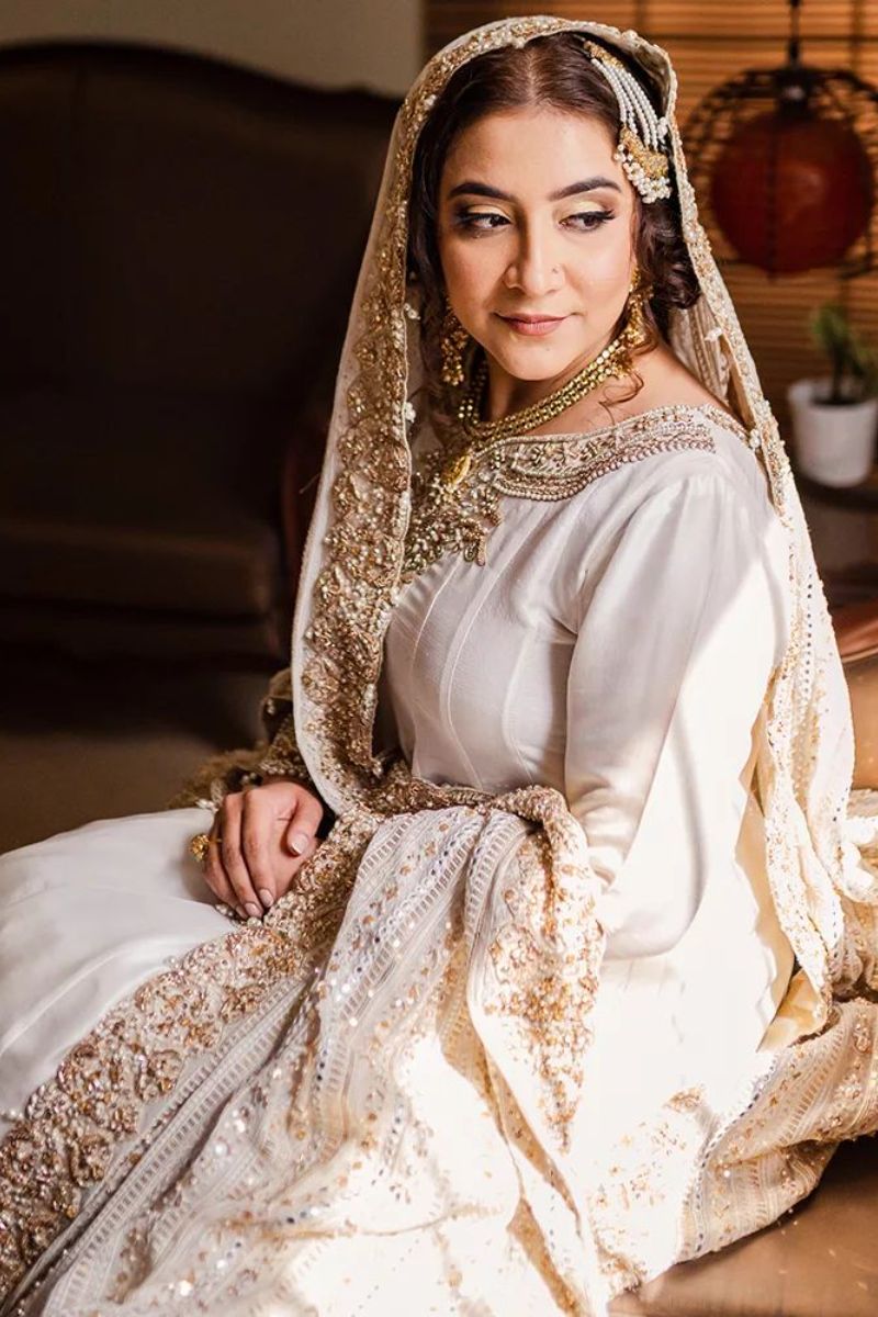 A heavenly pearl white attire with heavily embellished Chicken Kari Dupatta paired with Pishwas and Lehenga is perfectly divine for your Wedding.