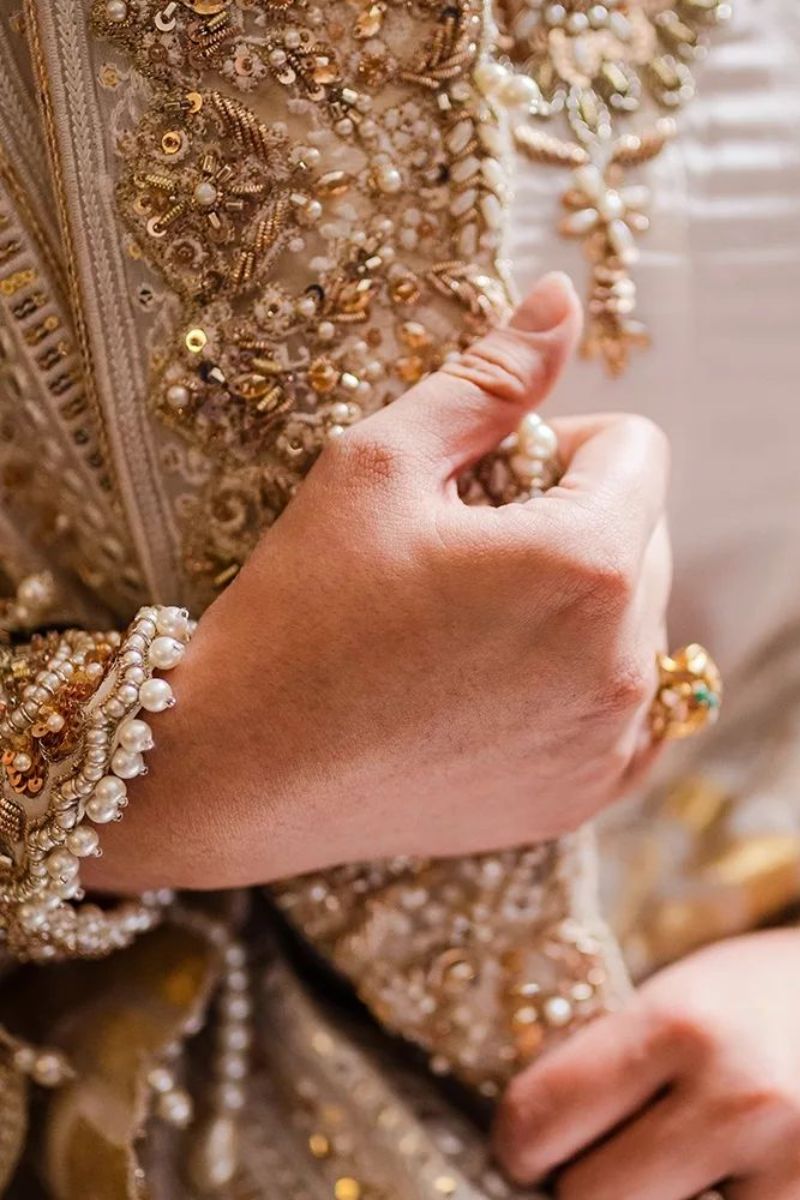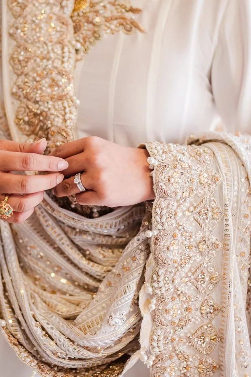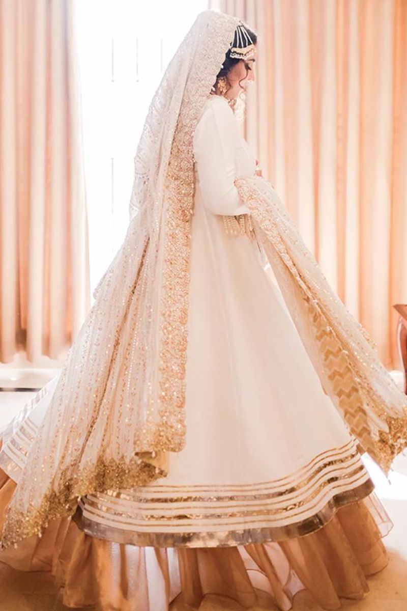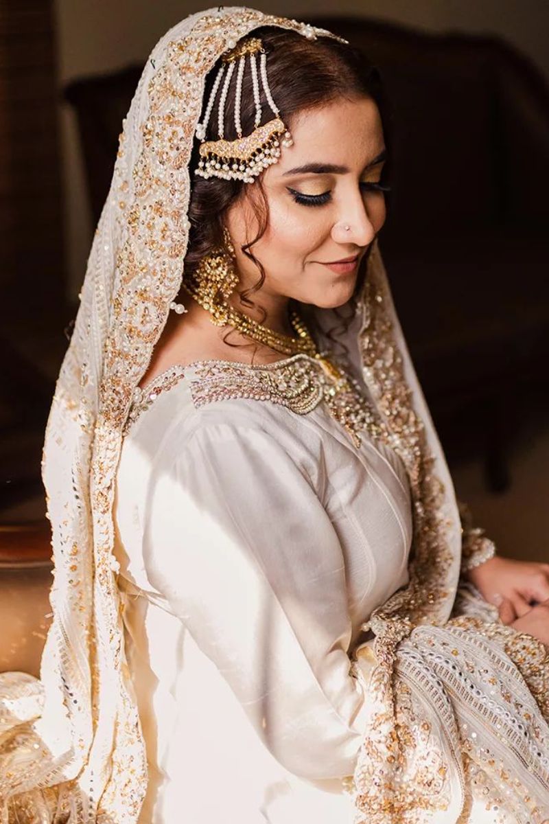 A heavenly pearl white attire with heavily embellished Chicken Kari Dupatta paired with Pishwas and Lehenga is perfectly divine for your Wedding.