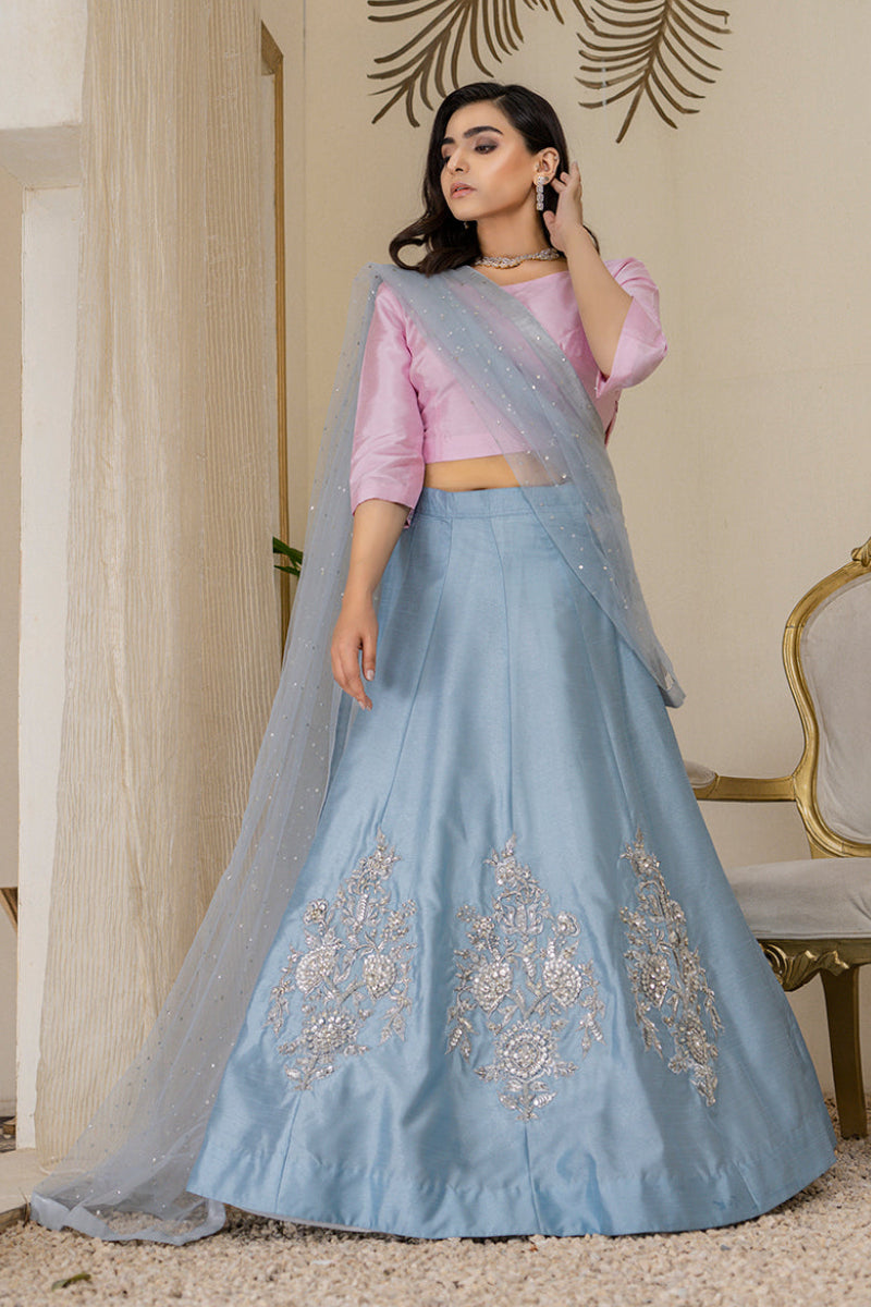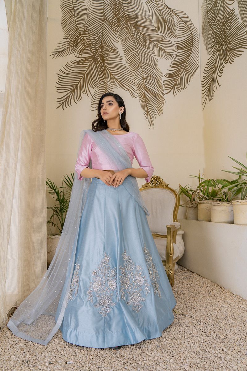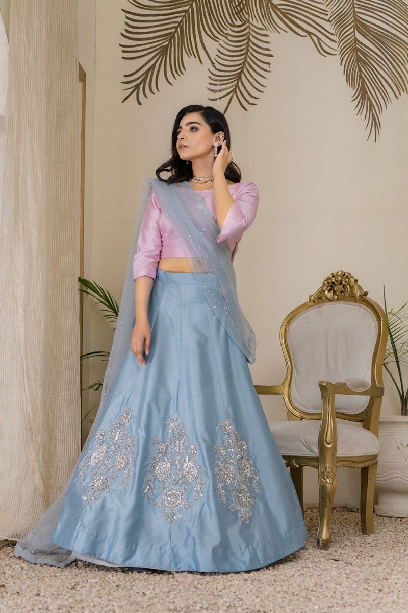 : Stay classy yet traditional in our rawsilk lehnga choli with meticulous motif work on lehnga that is beautifully hand embellished.