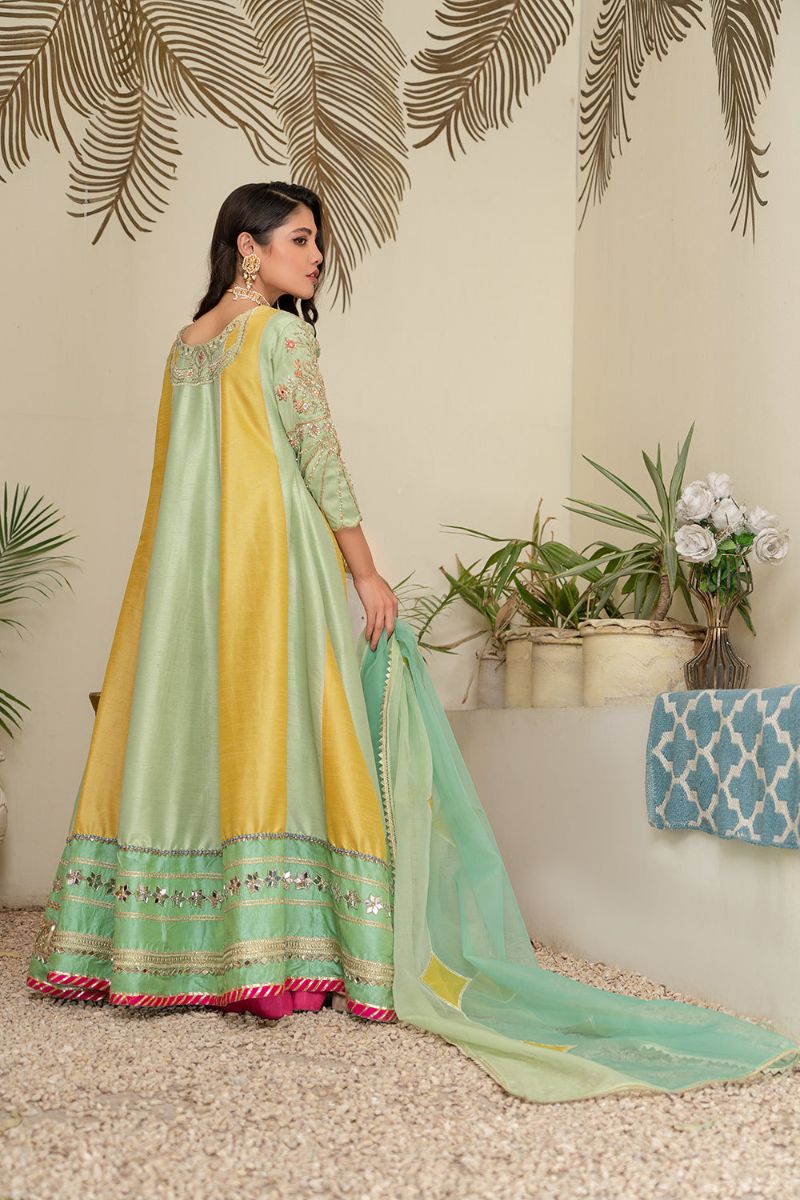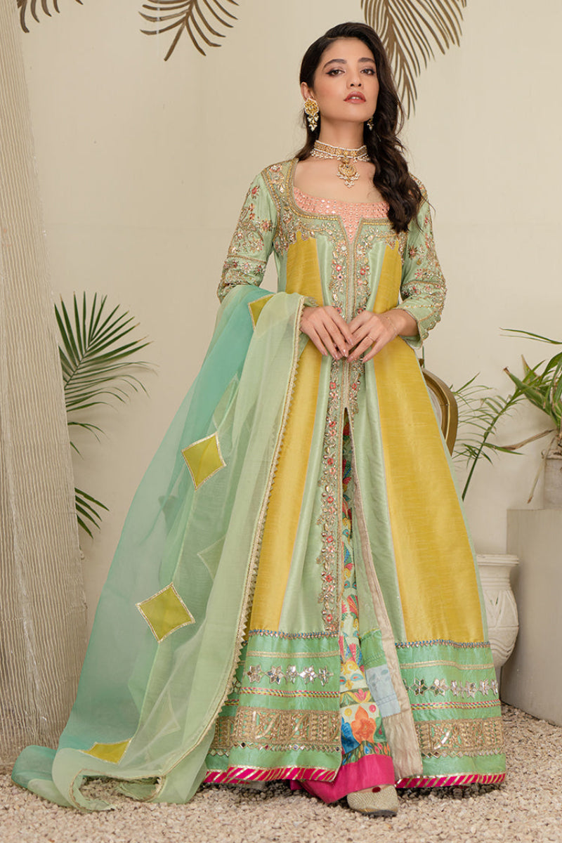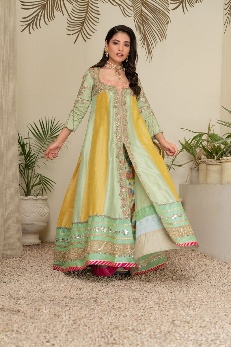 Detail: A pistachio hued rawsilk with thread and sheesha work paired with digital sharara pants. Front open pishwas. Embellished with beautiful zardozi work.