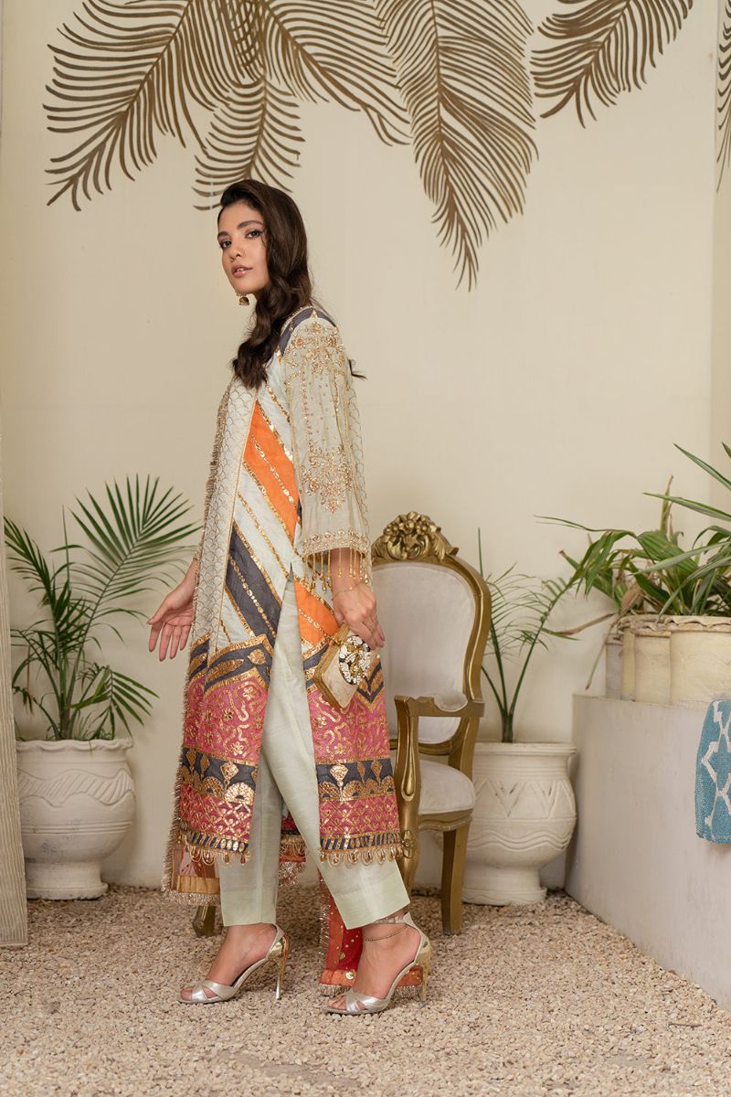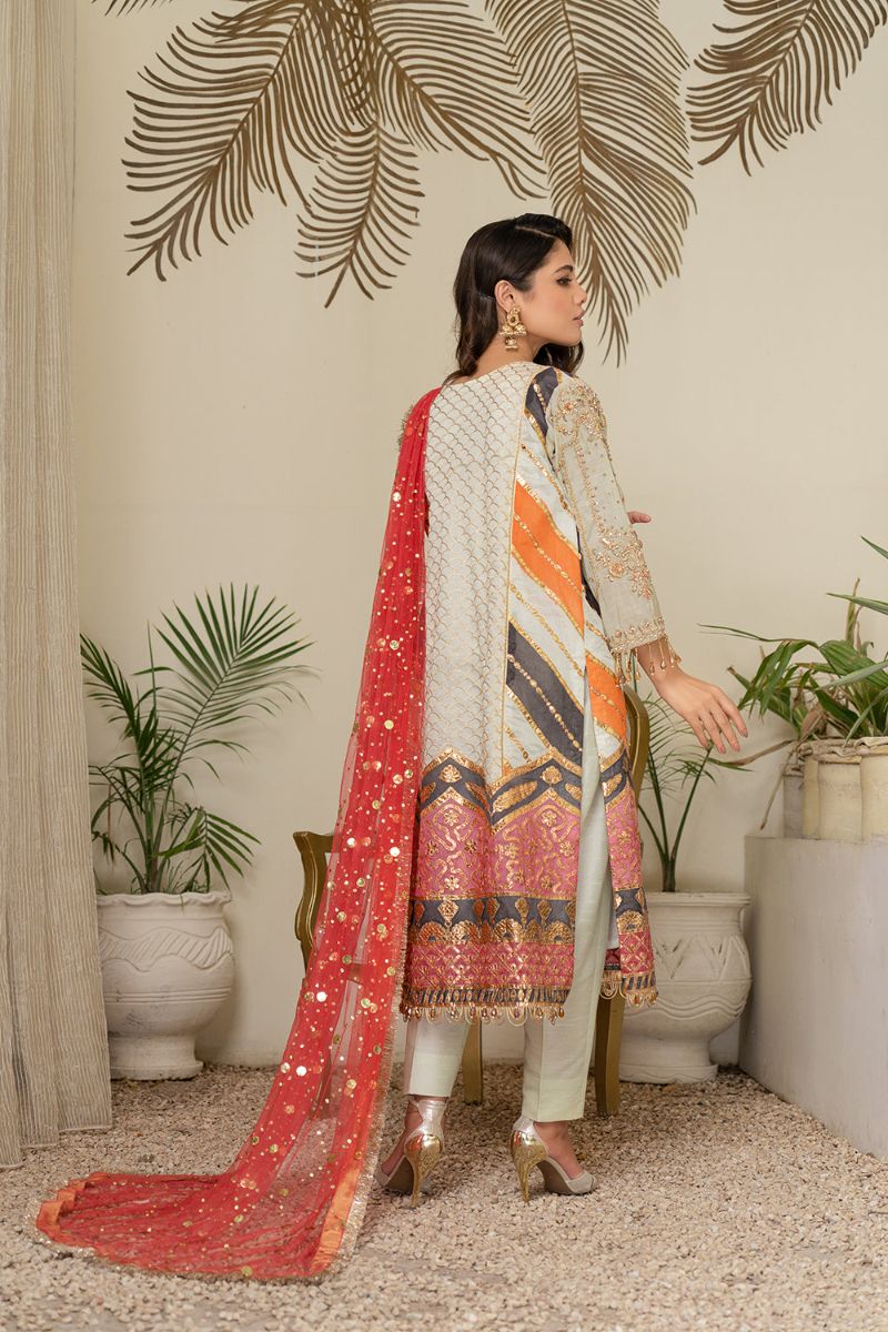 Detail : This ivory ensemble brought a radiant finish with traditional multi-color border hem paired with coral color mukesh work on net dupatta finely finished with kiran on four sides.