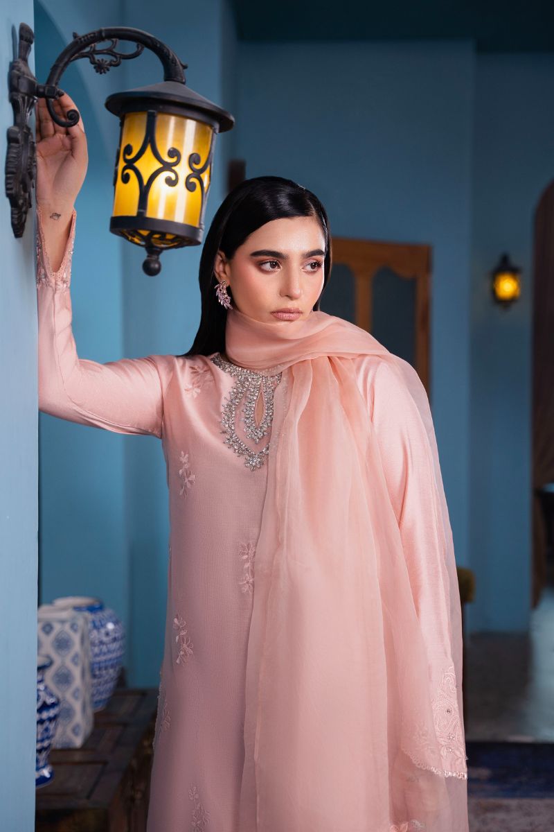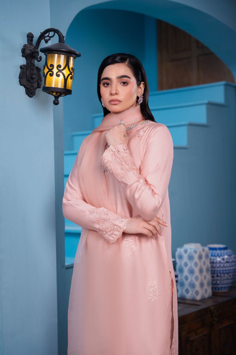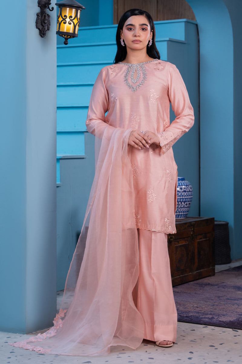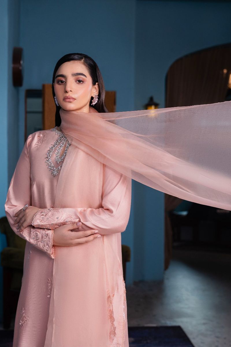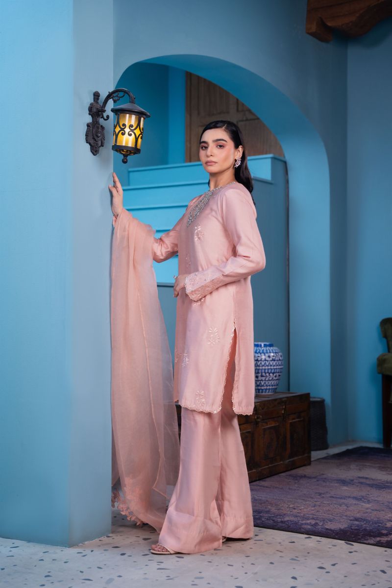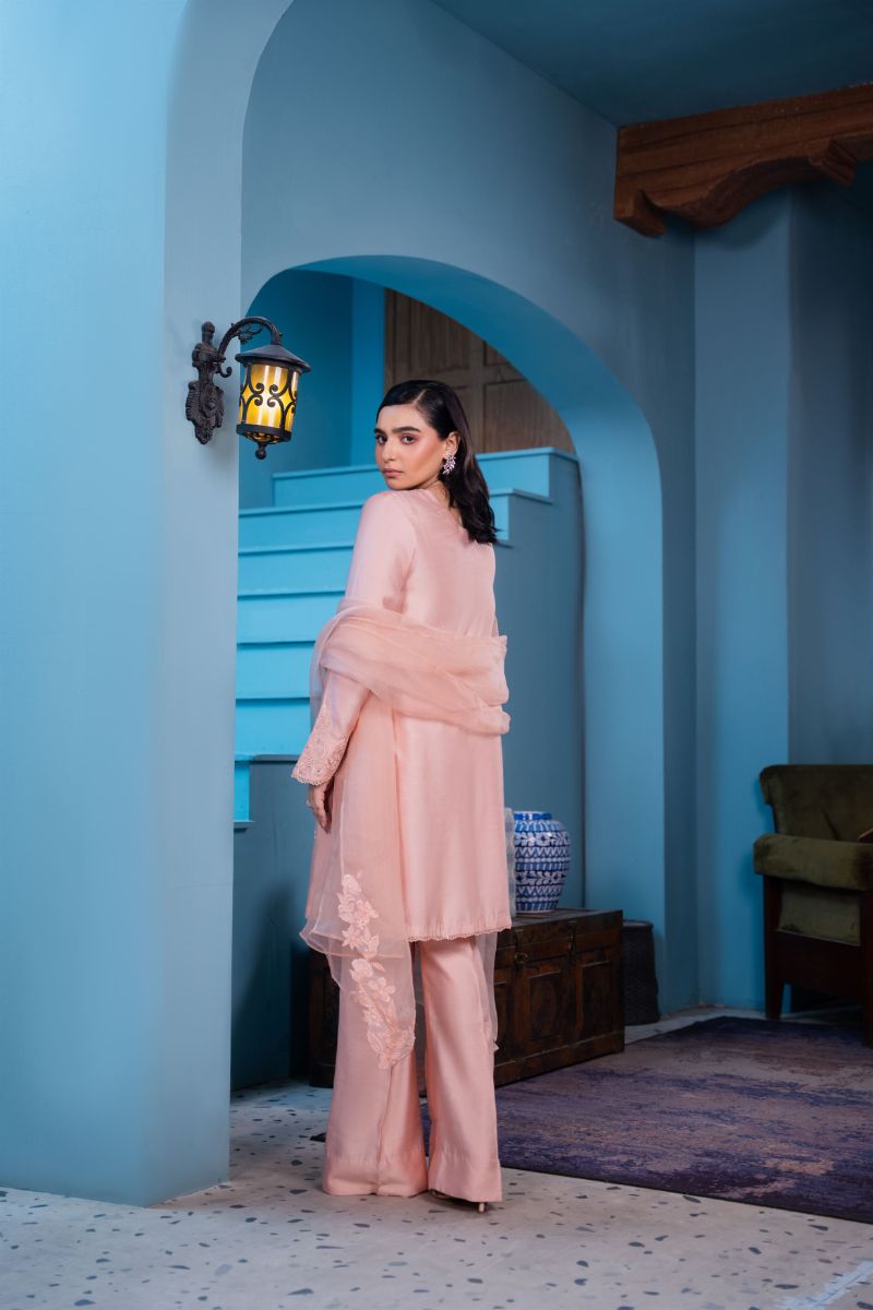 This charming three-piece dress in peach features a pure cotton net shirt paired with matching pure cotton net trousers and an elegant organza dupatta. The shirt's breathable fabric ensures comfort, while the loose-bottom pants offer a relaxed and stylish silhouette. The organza dupatta adds a touch of refinement.