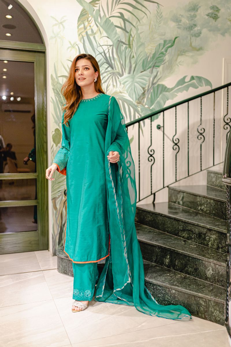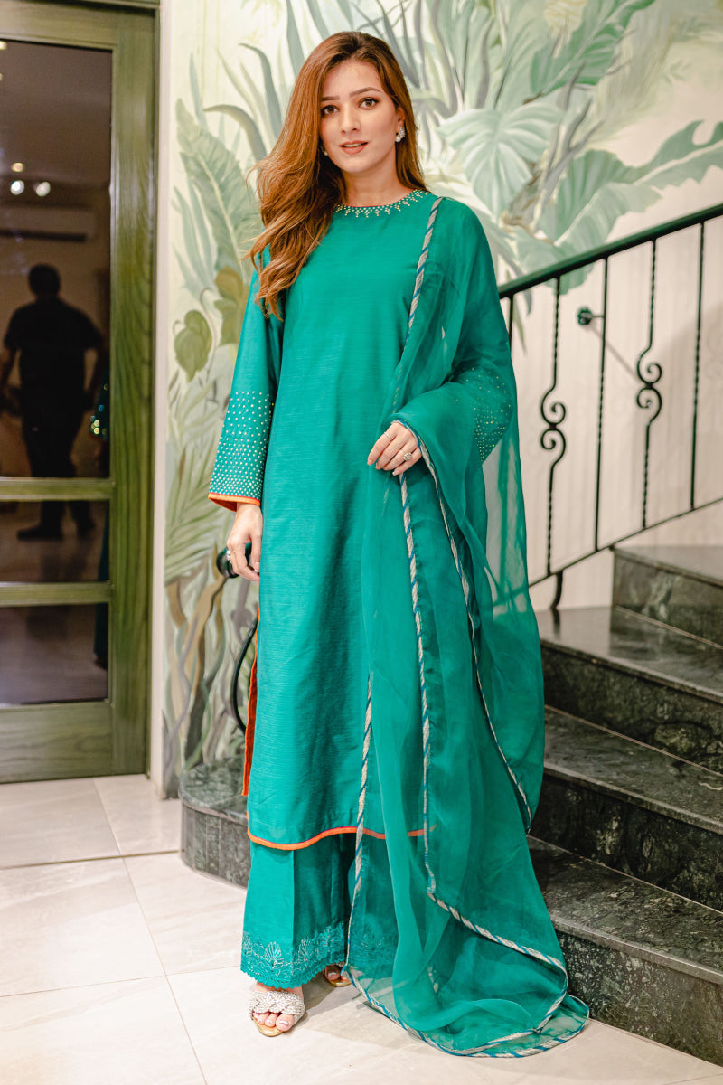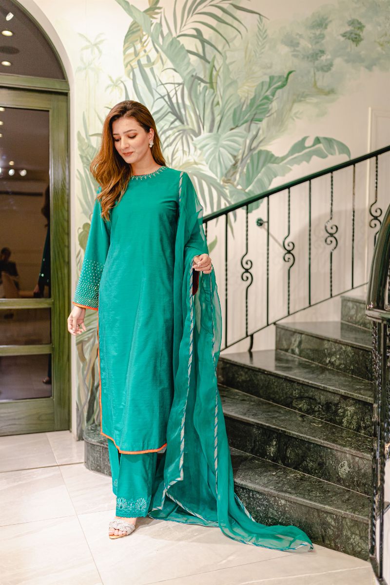 Color - Teal Green Two tone hand loomed, slightly embellished, Rawsilk shirt Two tone hand loomed embroidered trouser Organza duppatta finished with jamawar