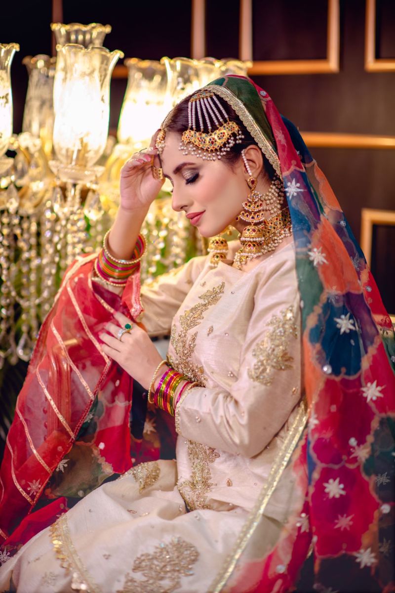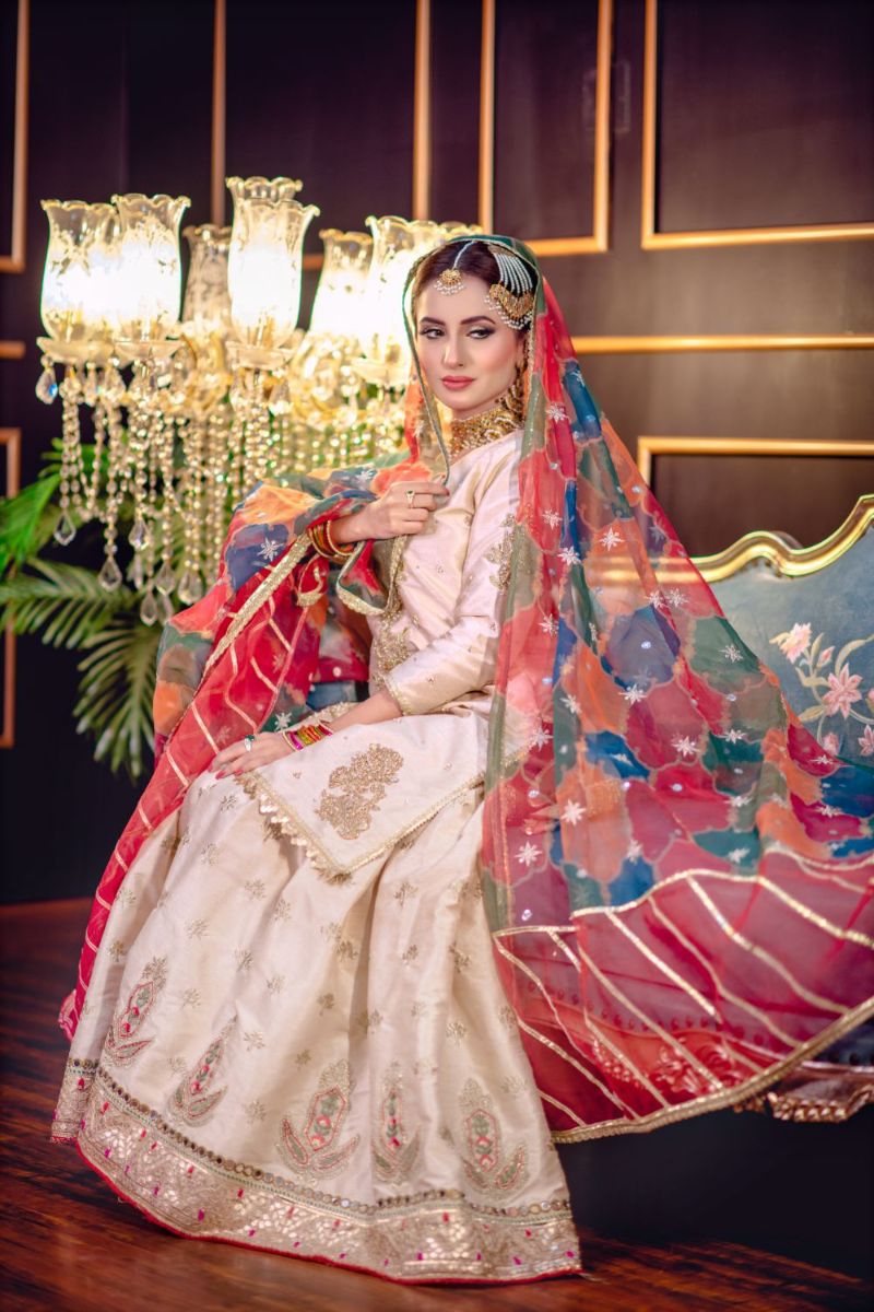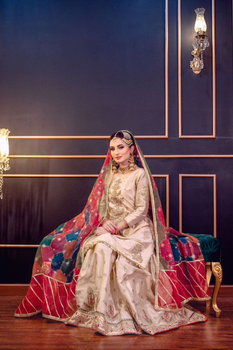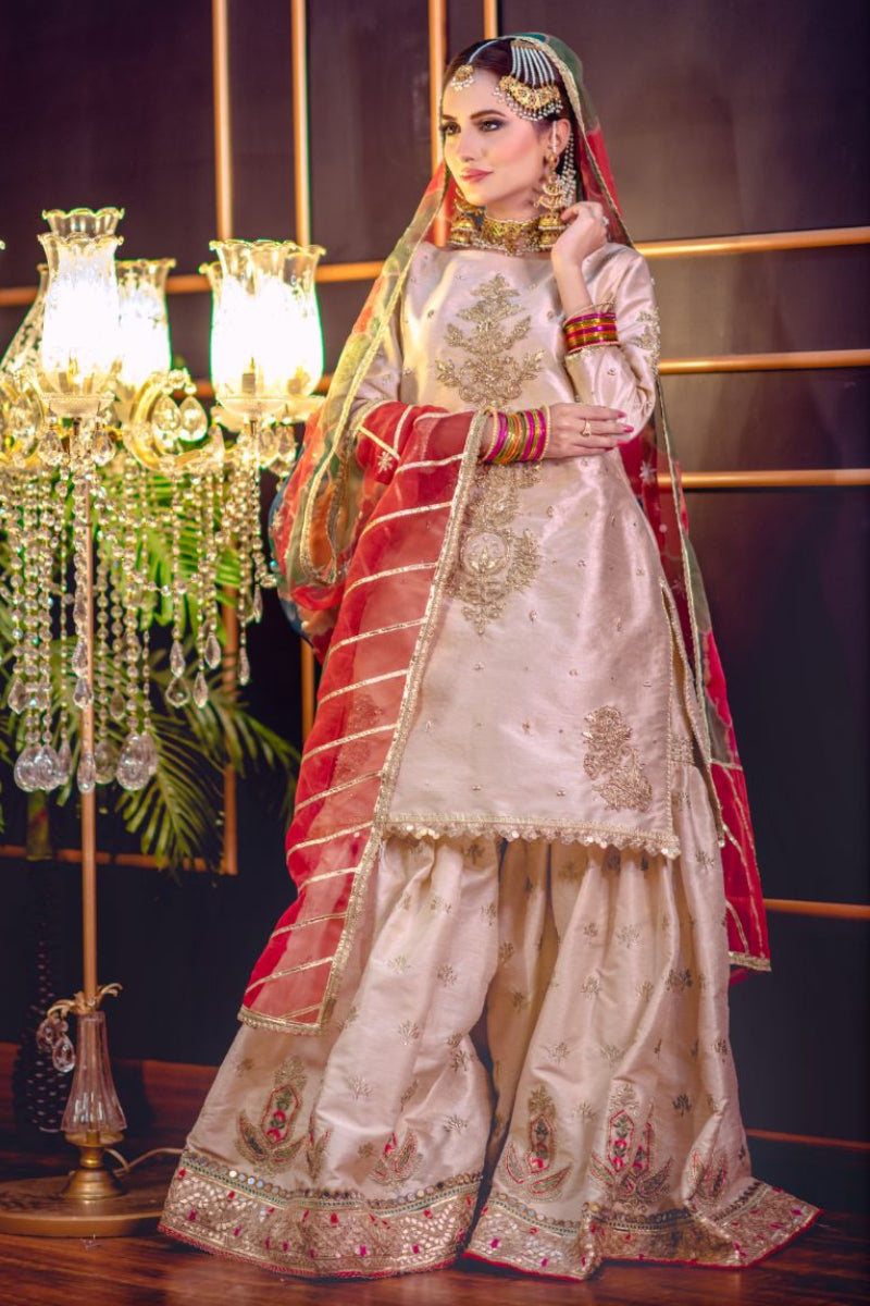 Extravagance meets perfection! classy Swarovski embellished peplum fused along tailed sharara and radiant pearled dupatta makes astonishing dress together. be ostentatious with this antiqued yet stylish attire