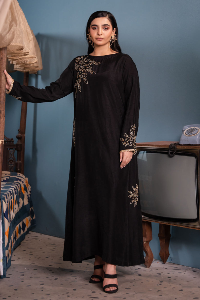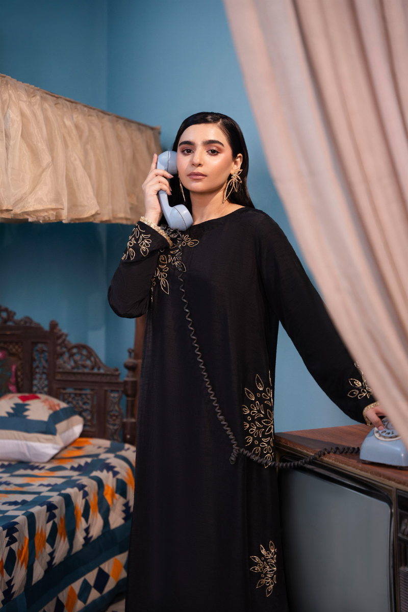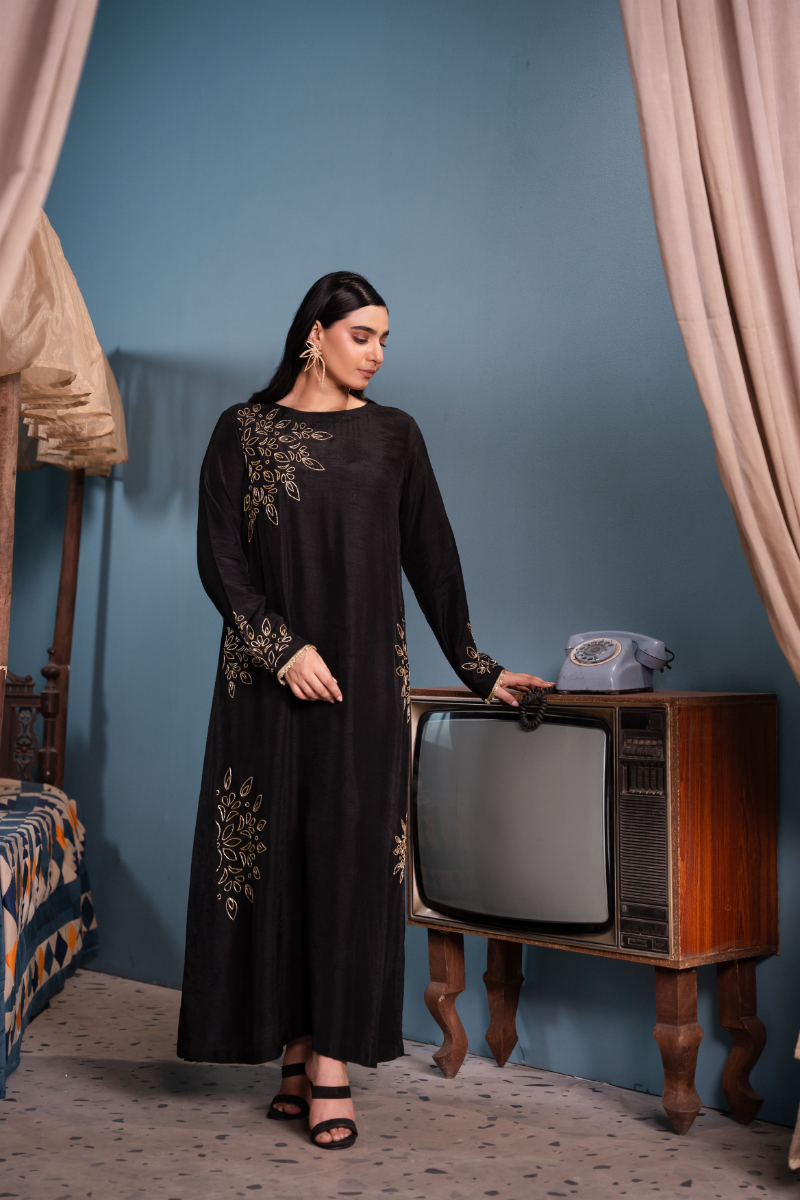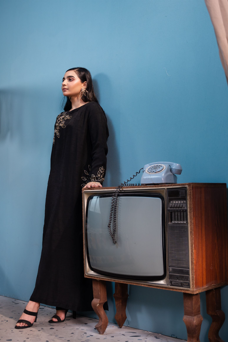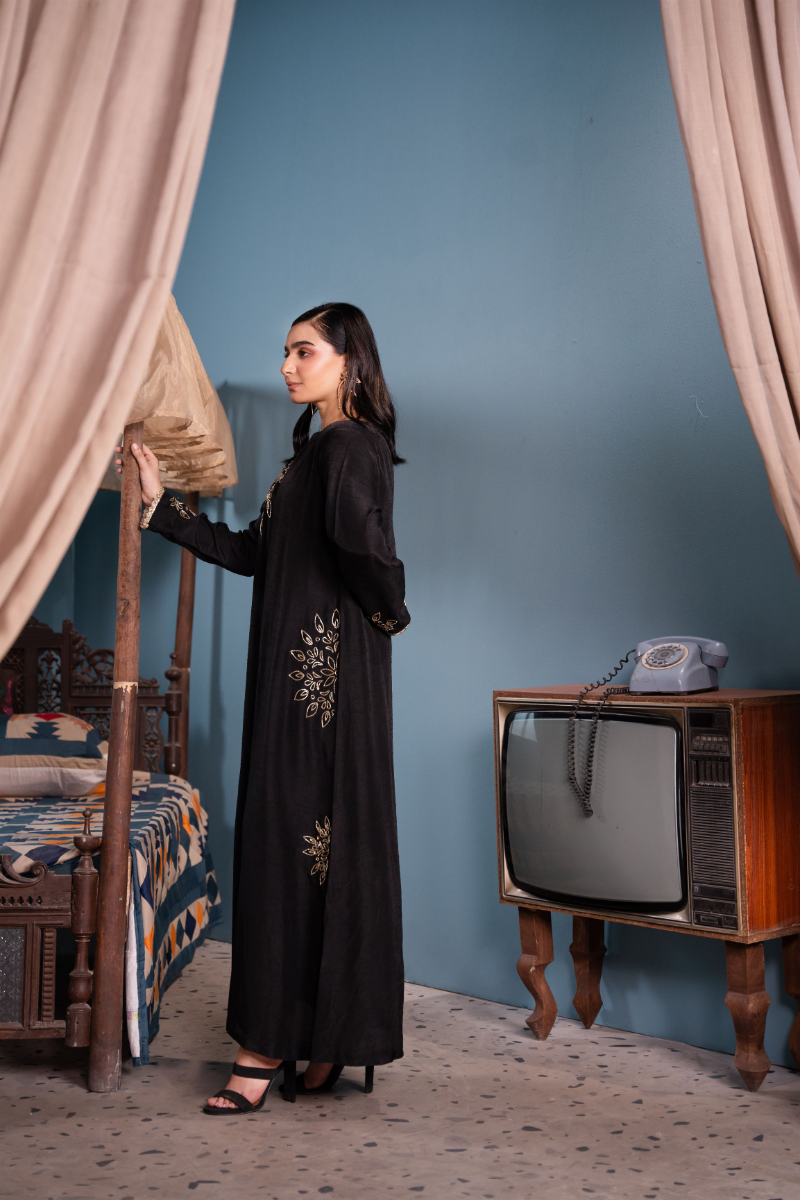 This elegant ensemble features a striking black kaftan shirt crafted from luxurious Korean raw silk, Paired with matching raw silk trousers, completing the look is a dupatta in your choice of either delicate organza or airy chiffon, both adorned with intricate Rangoli-style designs outlined in shimmering cut beads, adding a touch of opulent detail. The result is a harmonious fusion of traditional elegance.
